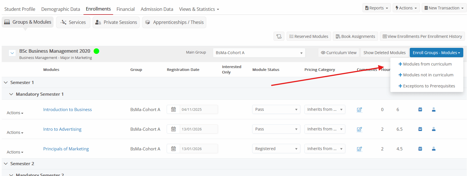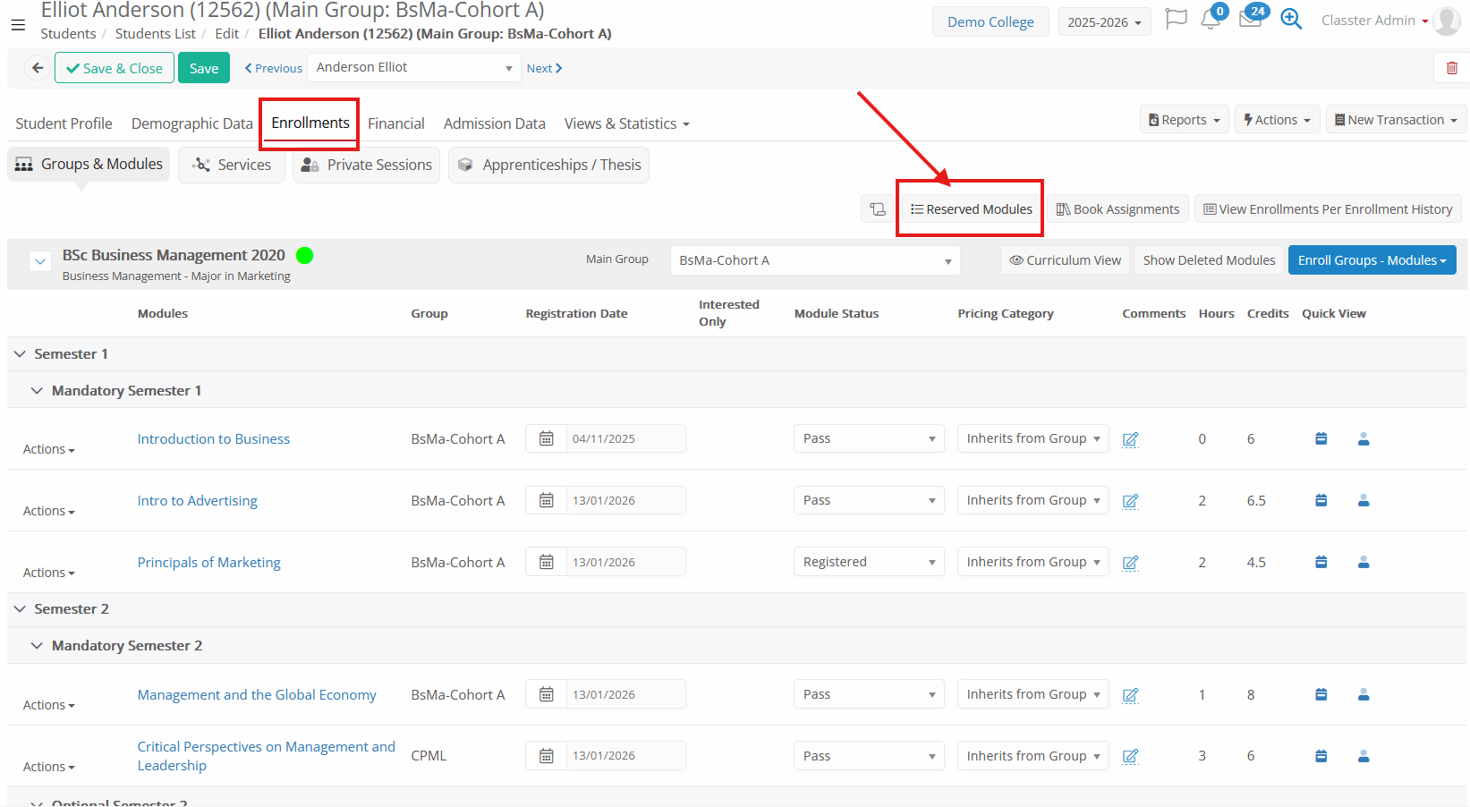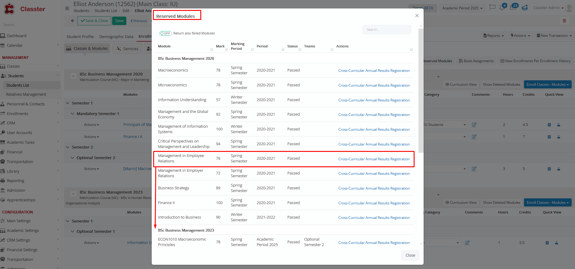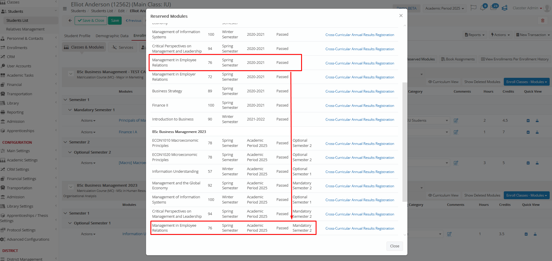 The system will detect if a student has reserved and previously passed a subject in another curriculum when pressing the Reserved Subjects button in the Enrollments tab.