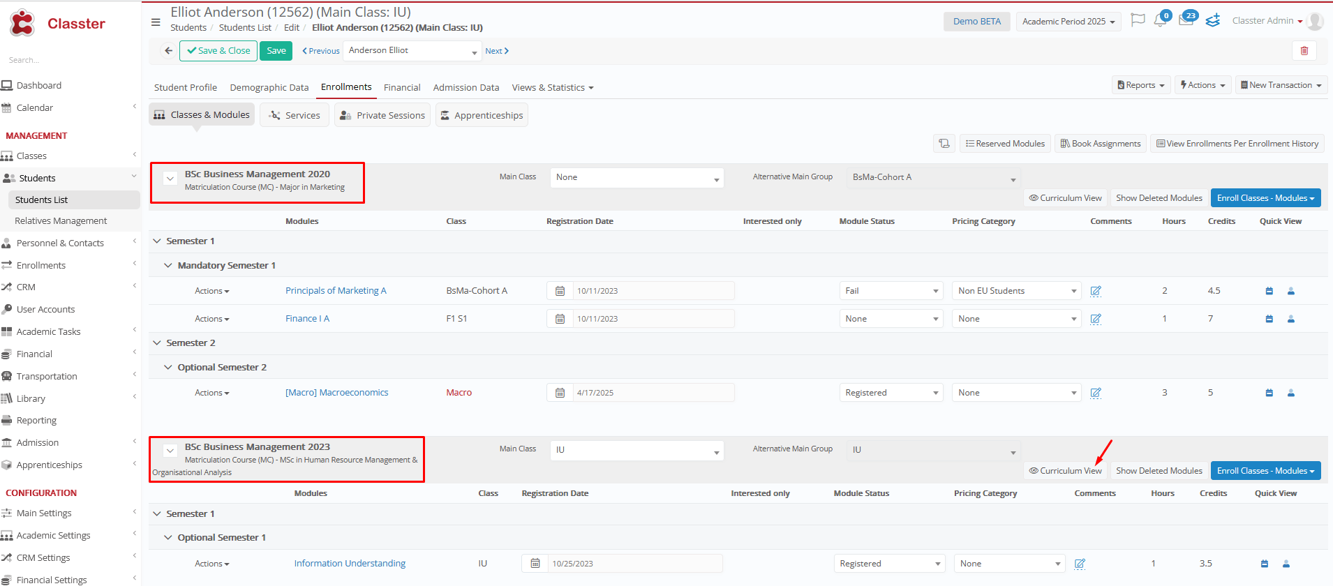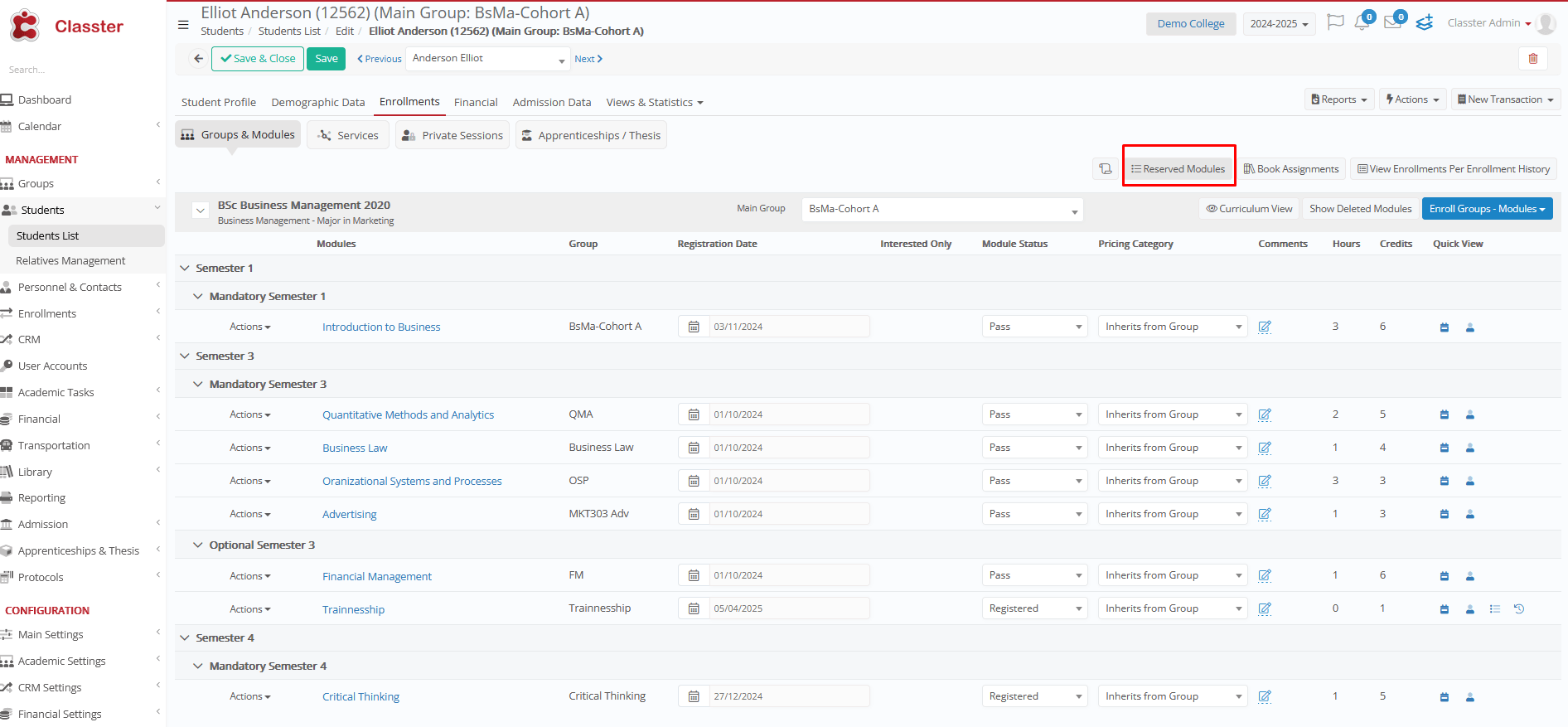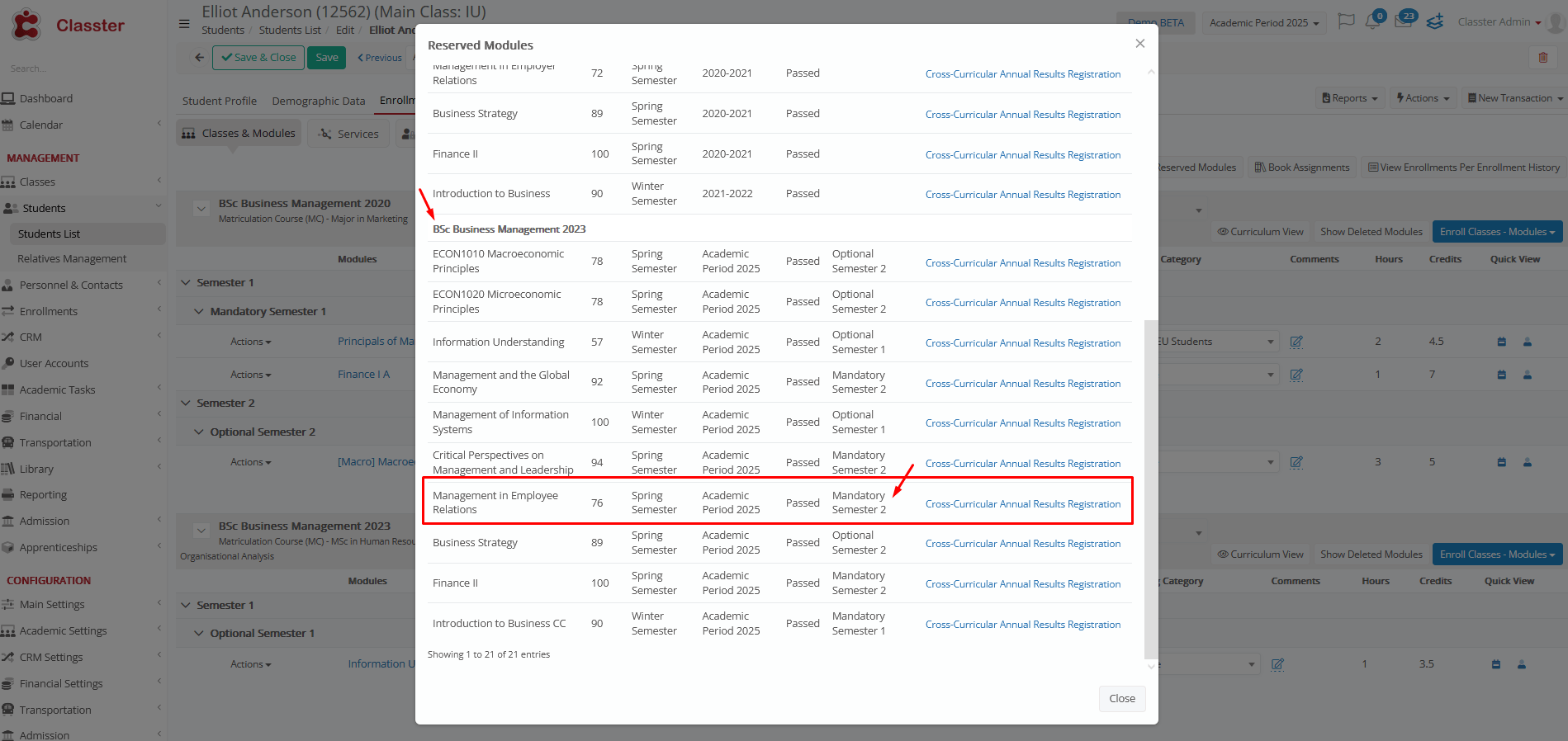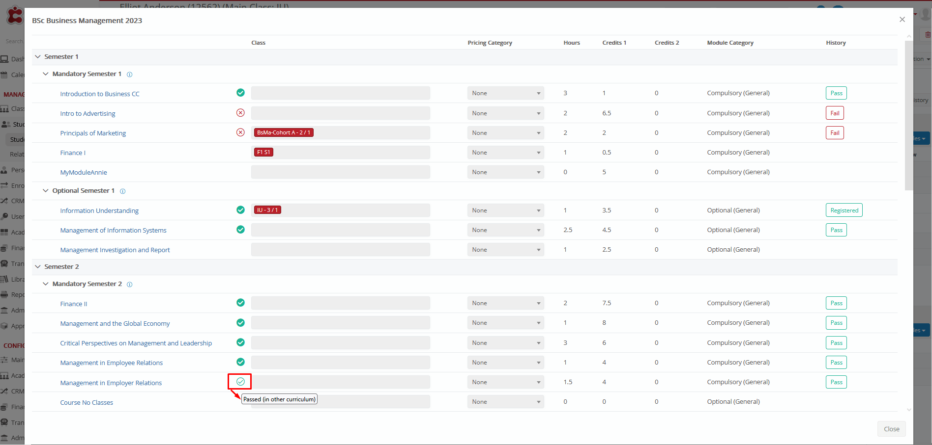 The system will detect if a student has reserved and previously passed a subject in another curriculum when pressing the Reserved Subjects button in the Enrollments tab.
