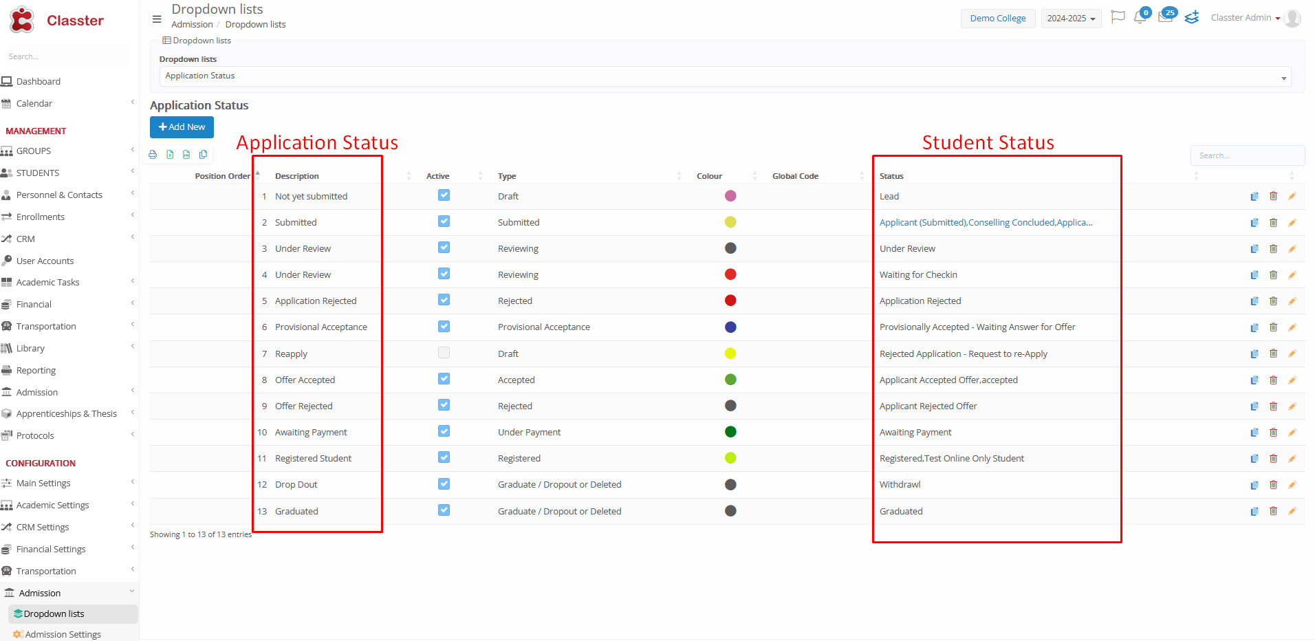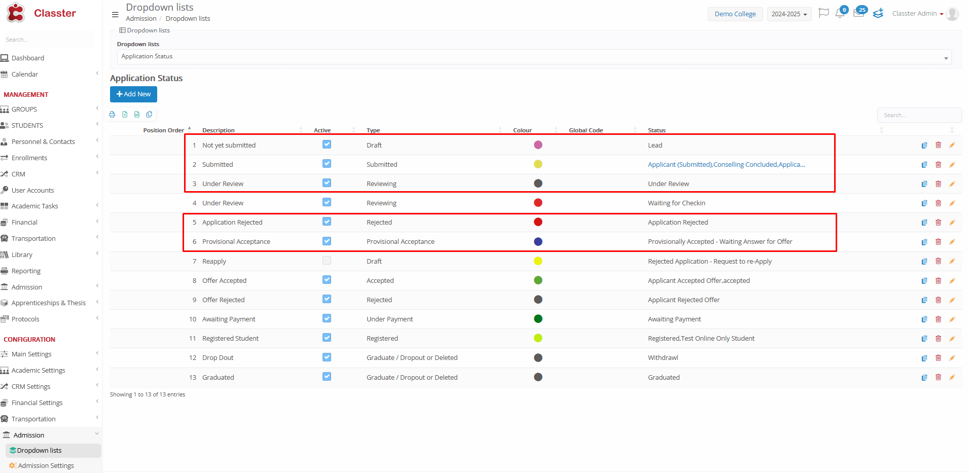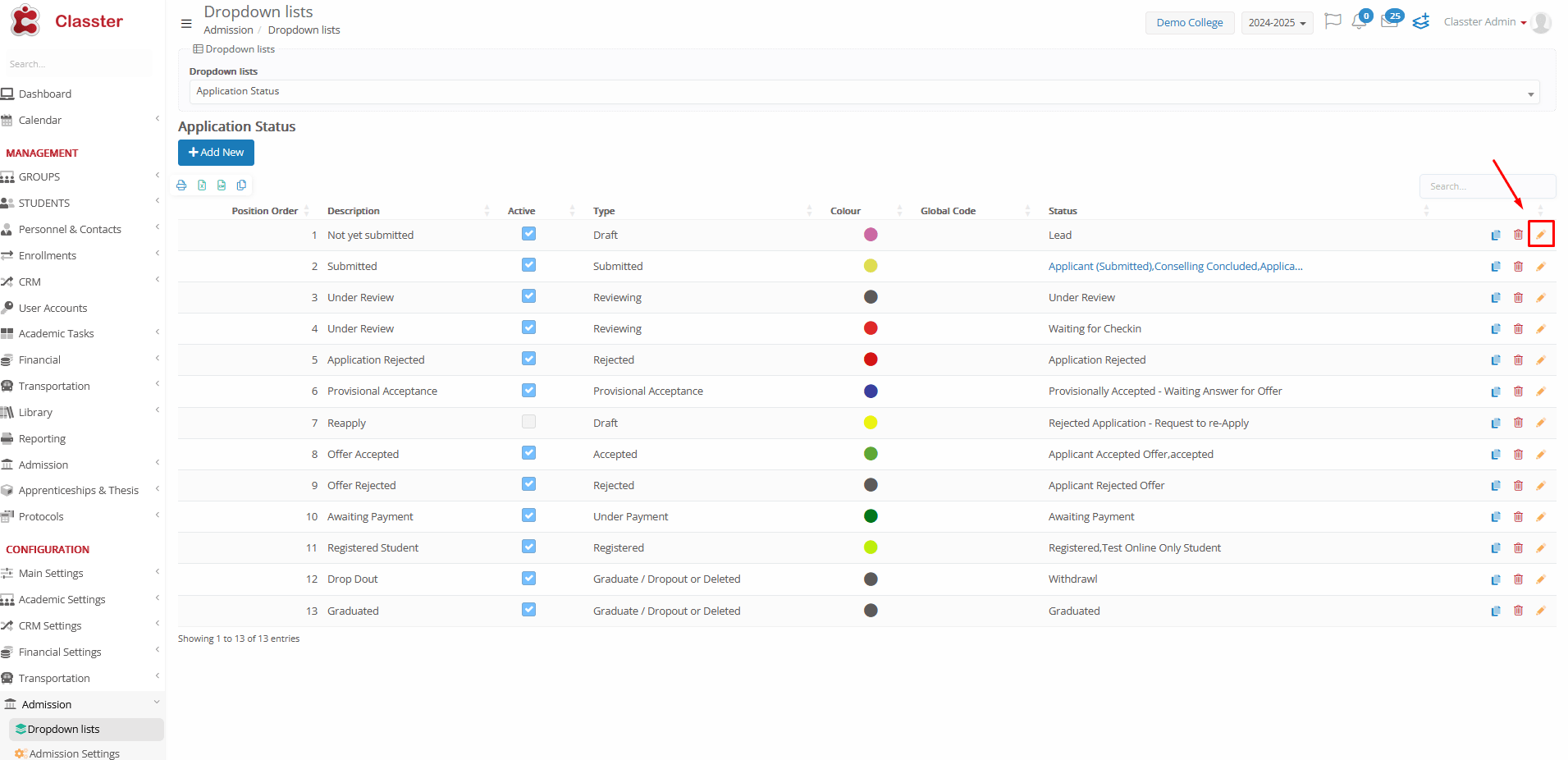 To configure your institution’s Application statuses, navigate to Configuration > Admission > Dropdown lists > Application Status from the lists and Add new or Edit an existing one.