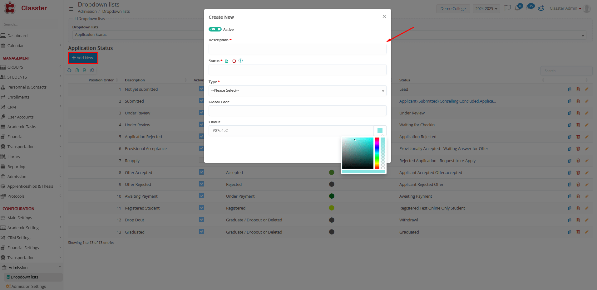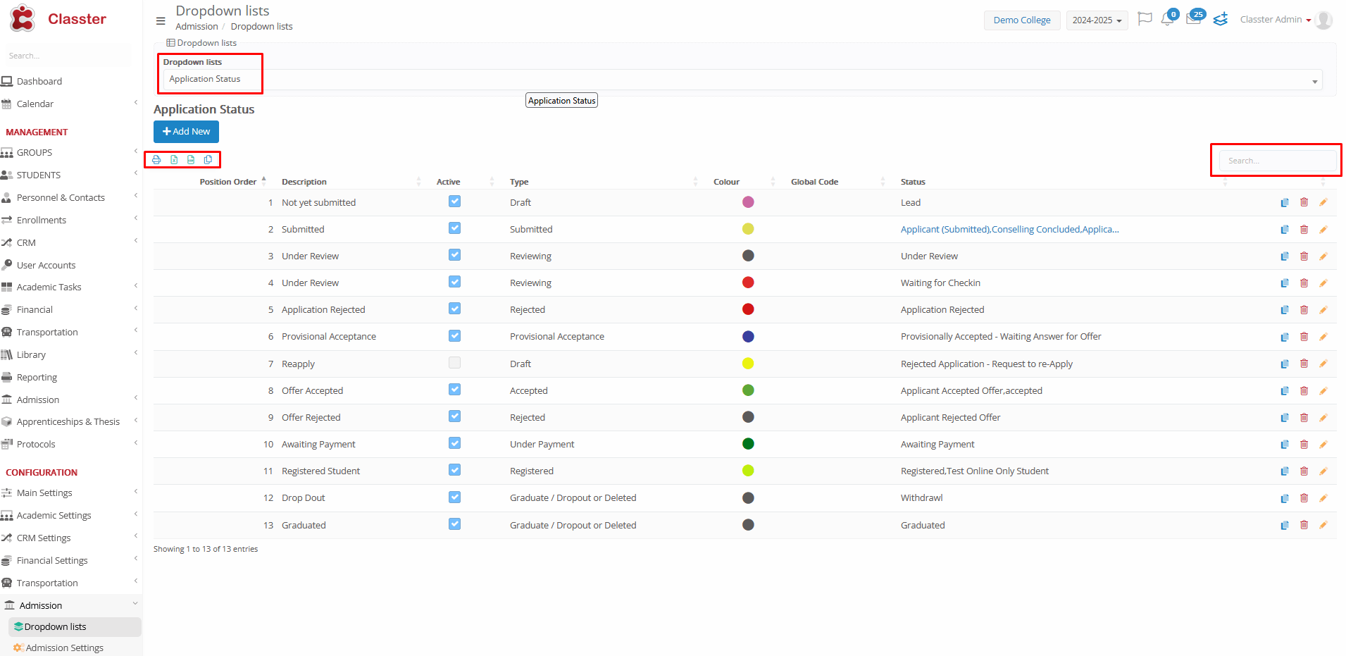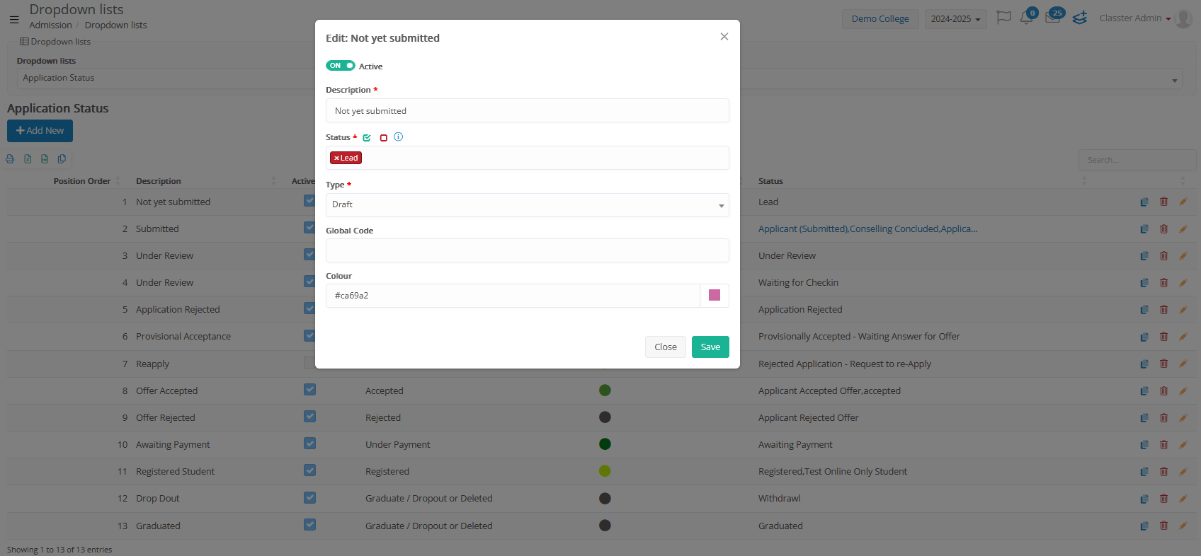 To configure your institution’s Application statuses, navigate to Configuration > Admission > Dropdown lists > Application Status from the lists and Add new or Edit an existing one.