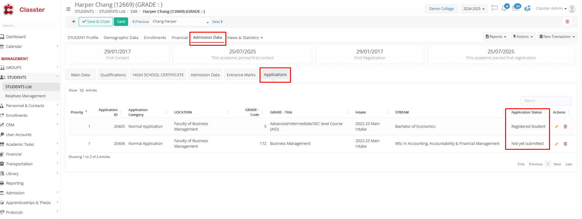 The Application Status feature tracks each applicant’s progress through the admission stages. Typical statuses include Draft, Submitted, Registered, and Rejected, though institutions may customize this according to their workflow.