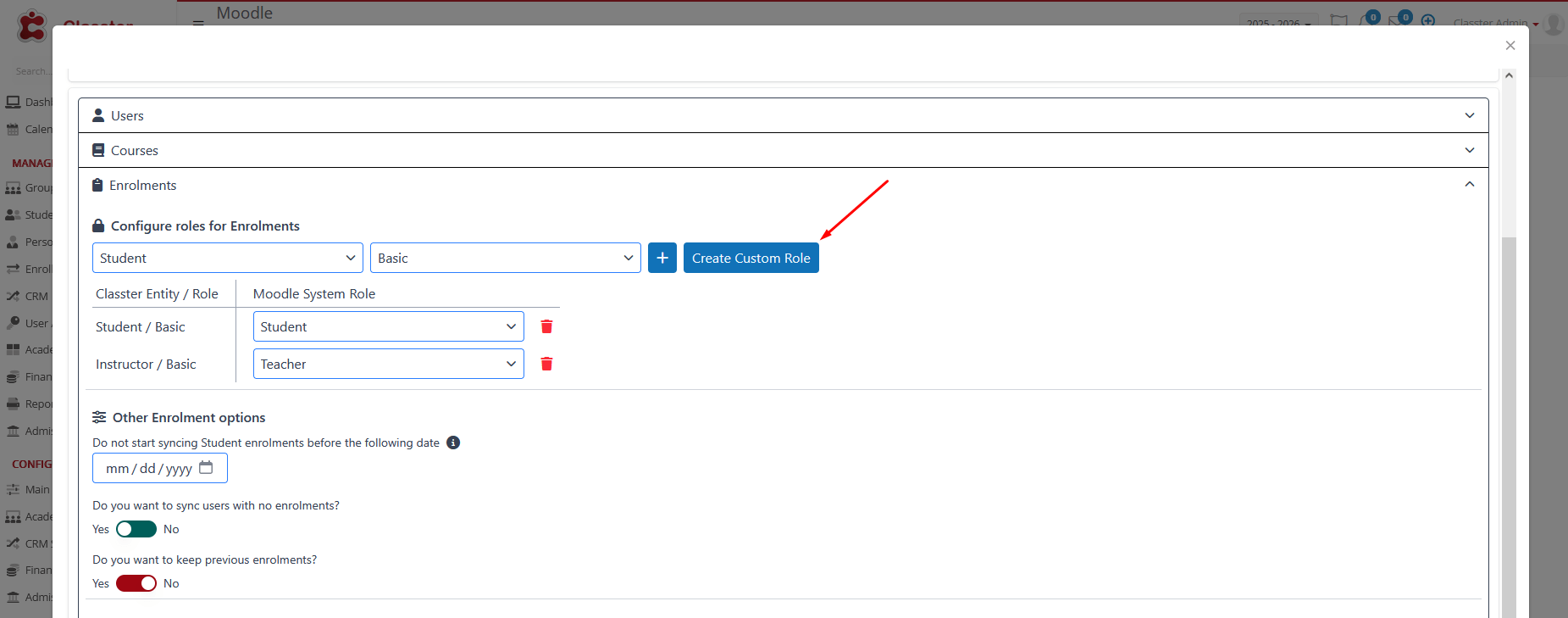 - Keep Previous Enrollments: Choose whether to keep previous enrollments in the system (Yes/No). IF YOU WANT CLASSTER TO ENROL SUBJECTS FOR USERS AND NOT UNENROL.