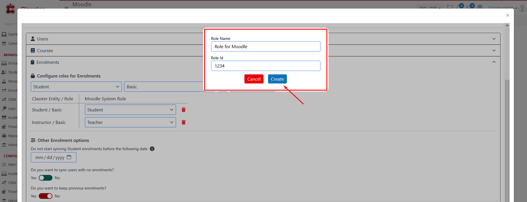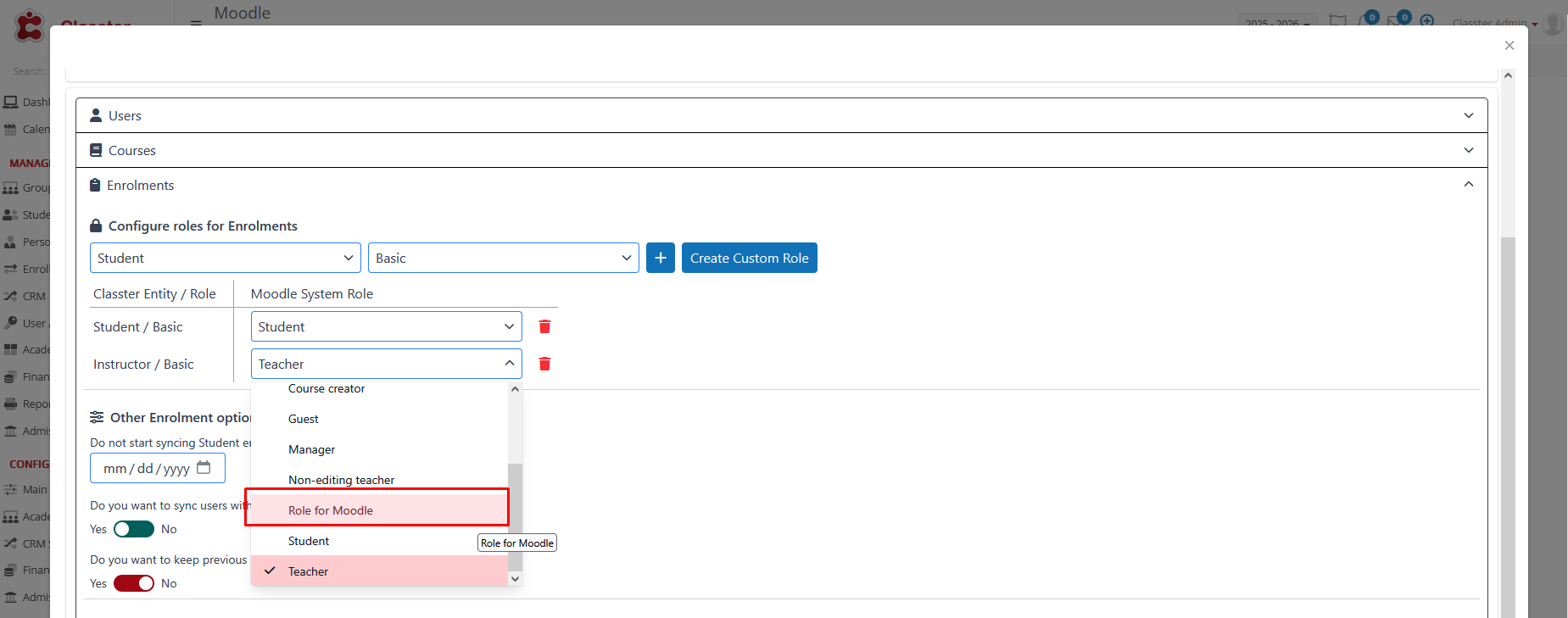 If there is a custom Role added to your Moodle account and you wish to add it here as well, press +Create Custom Role and the system will prompt you to enter two fields: