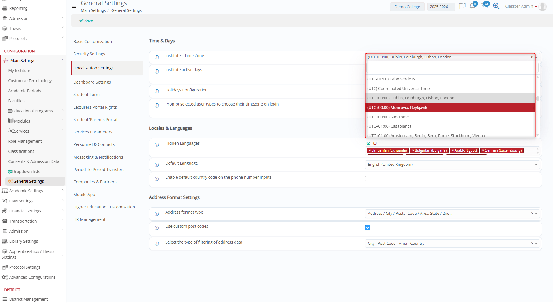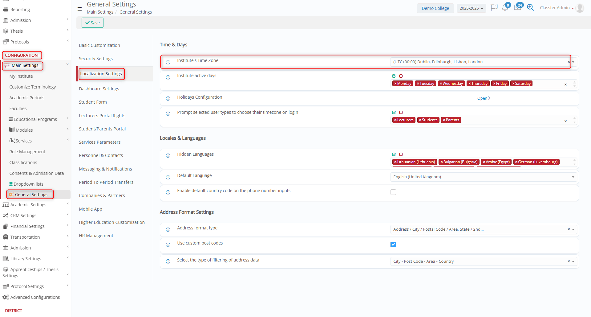 To update an Institute’s time zone, go to: CONFIGURATION > Main Settings > General Settings > Localization Settings> Time & Days > Institute’s Time Zone.
