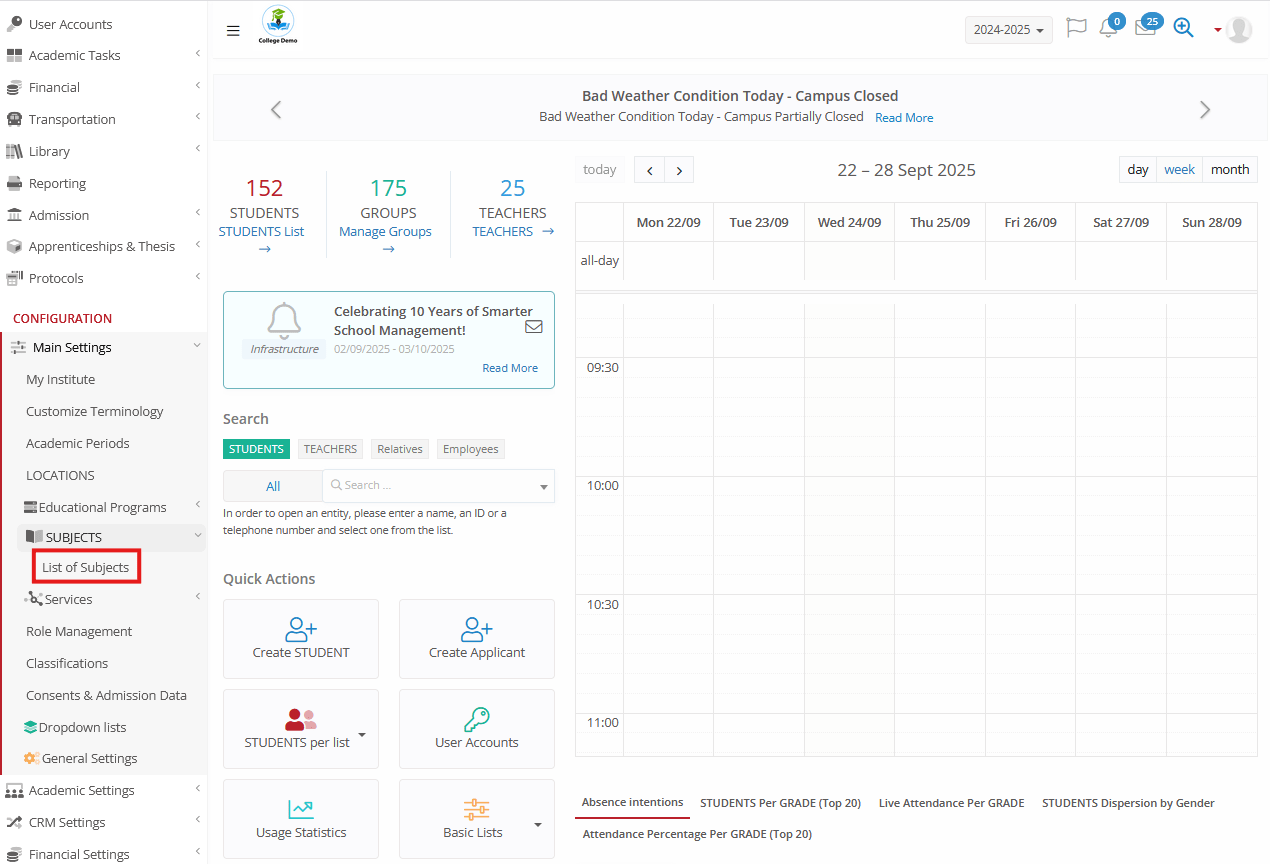 - Delete a Subject – Go to Configuration > Main Settings > Subjects > List of Subjects, find the subject, and choose ⋮ Options > Delete.