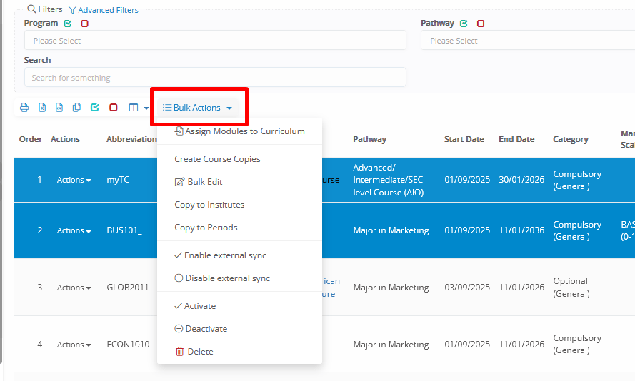 - Enable/Disable External Sync→ Refers to external systems integrations, such as LMS systems – Moodle, Brightspace. By default, all subjects are synced (after being enrolled for users) if you enable a relevant integration. But with these actions, you can manually disable/enable specific ones at your convenience.