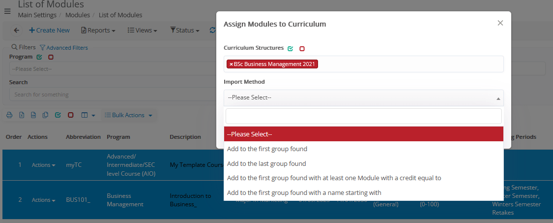 - Assign _Subjects_ to Curriculum→ Only for HE. This process supports specific methods to bulk/quick assign subjects to curricula, such as ‘add in first classification found’ in the curriculum. (The default curriculum creation of structure and adding subjects is done from the list of curricula)