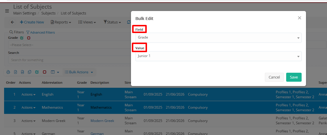 - Bulk edit → Select the Field you wish to edit and then the value to save. E.g., edit the field ‘_Grade_’ with value ‘Junior 1’.