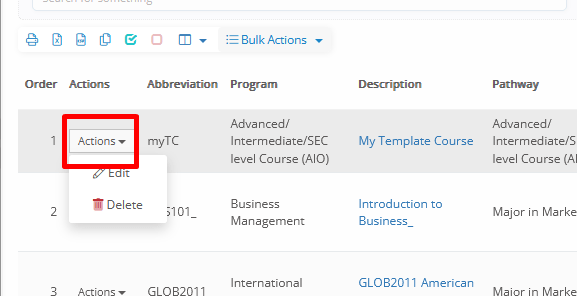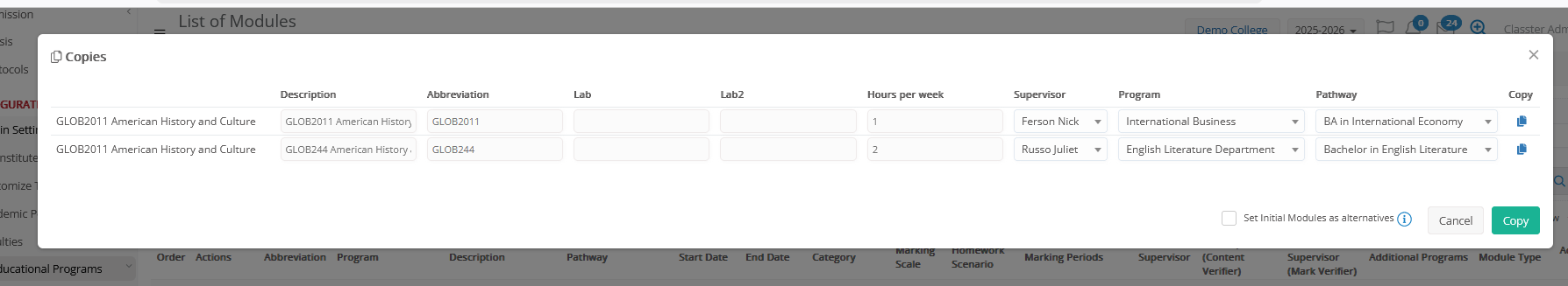 - Create _Subject_ copies → Opens a bulk creation of copies in rows, with options to change the Abbr, Description, Lab, Hours per week, Supervisor, _Grade_, and _Stream_.