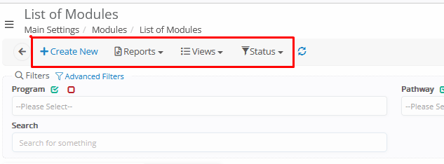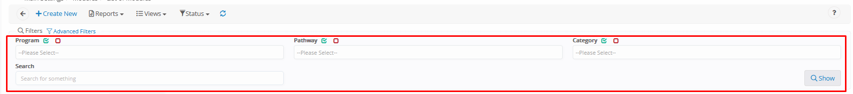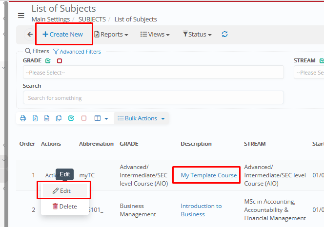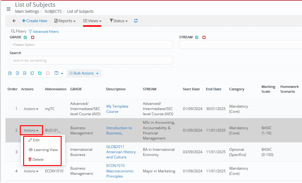 - Status Filter → Show All, Active, or Inactive _Subjects_.