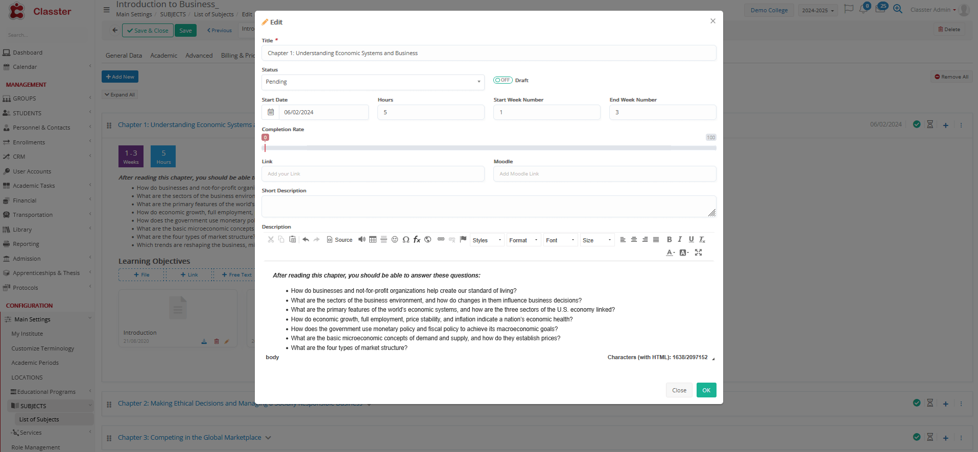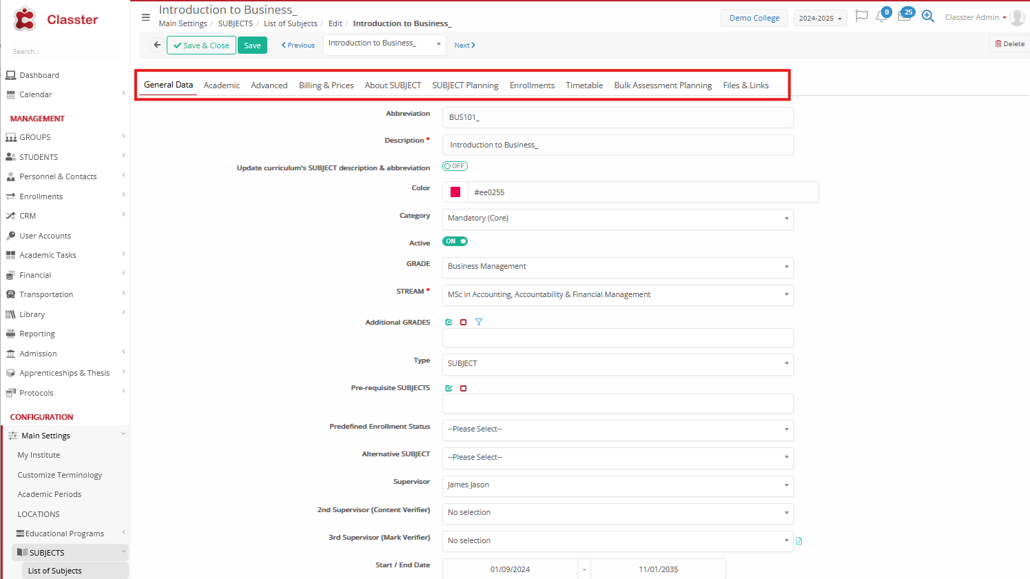 With the entity _Subjects_ in Classter, we refer to the subject/course, considering the content, such as ‘mathematics’, ‘physics’, ‘introduction to databases’, etc.