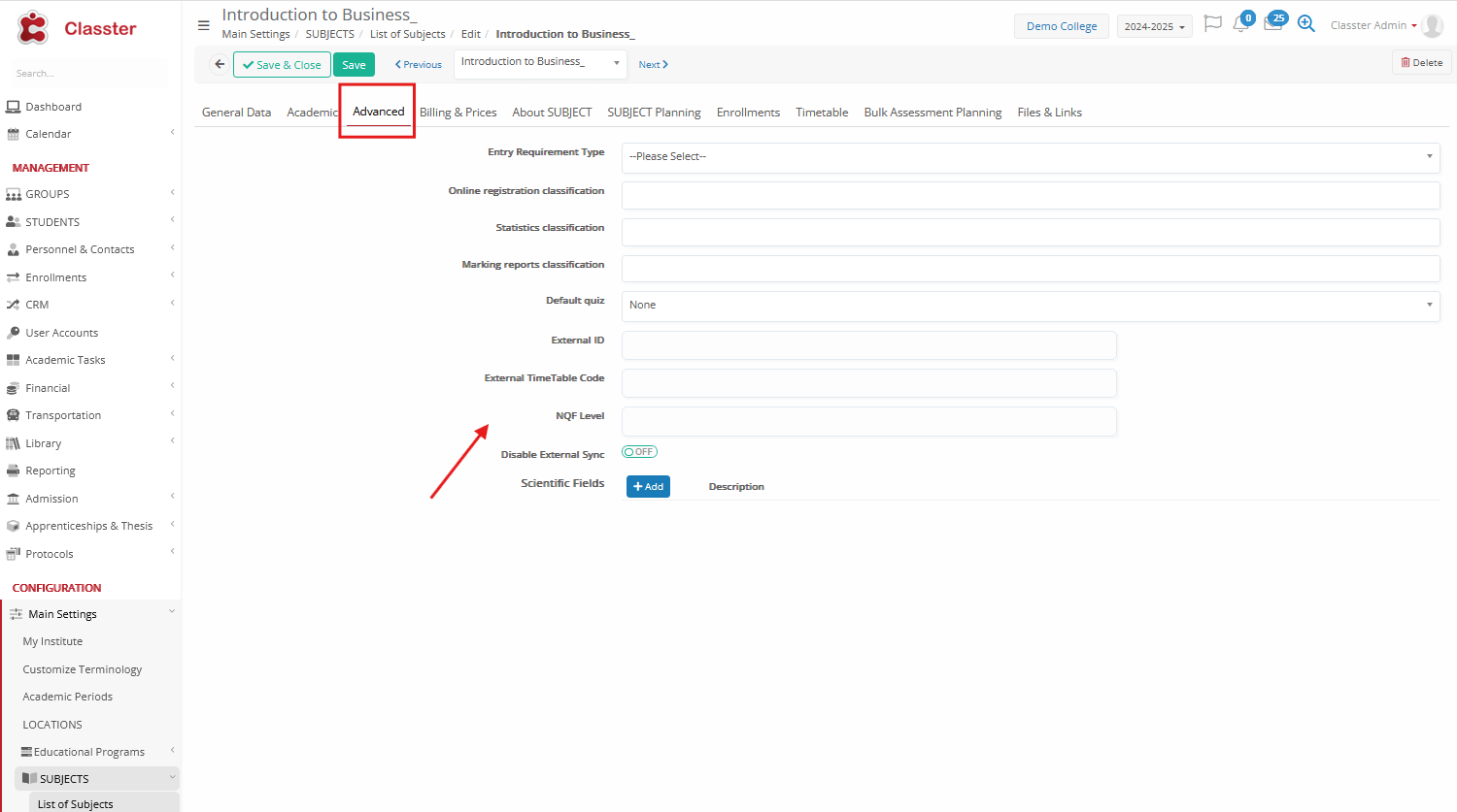 - Advanced Tab (admission, statistics, quiz, reports, external integrations & scientific fields properties)