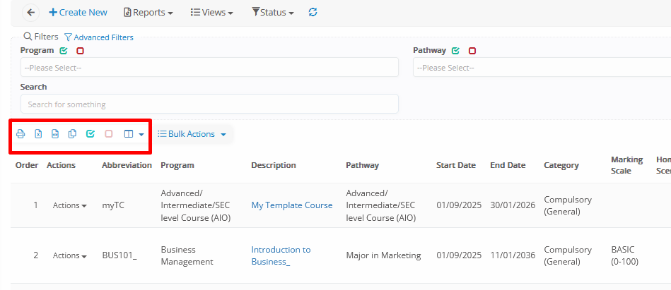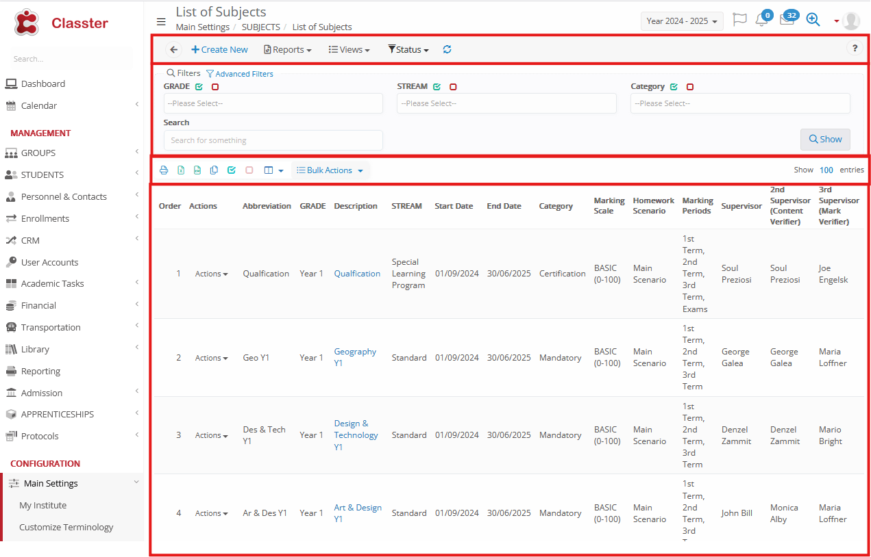 - Bulk Actions → Apply actions to multiple subjects at once (e.g., delete, export).