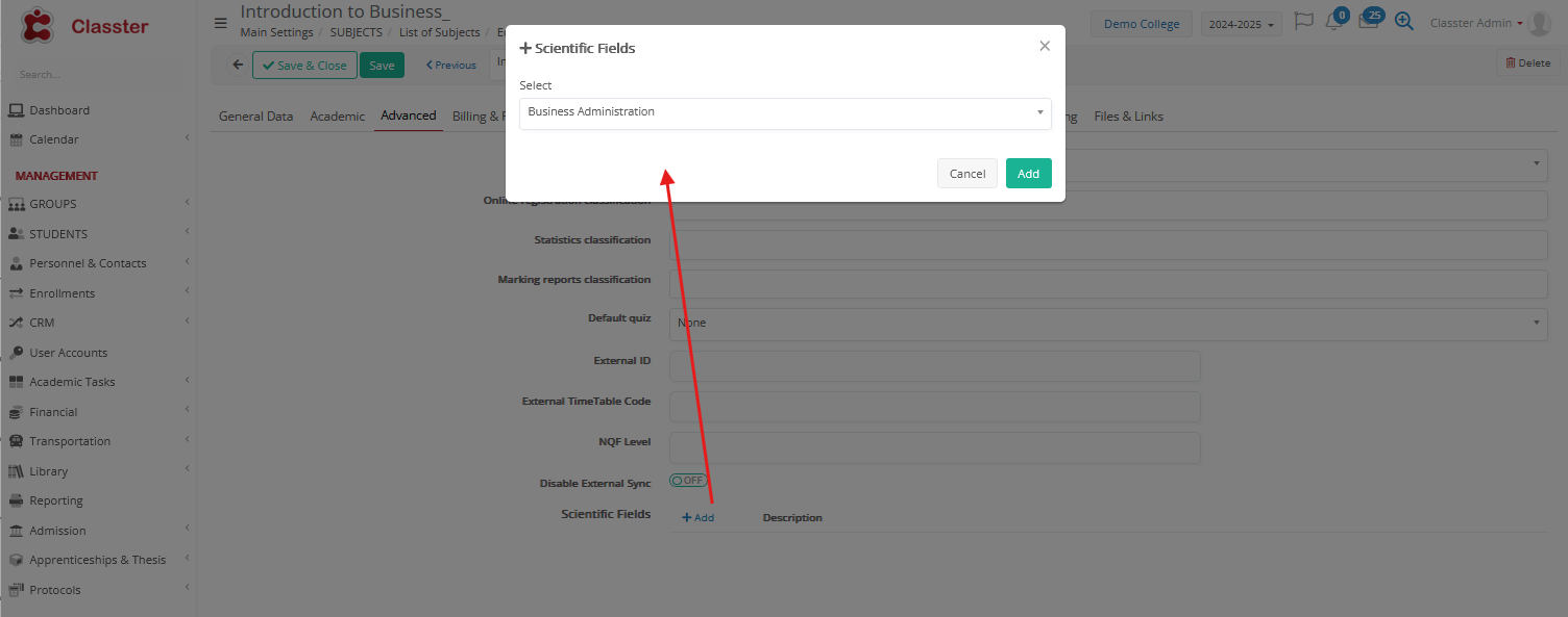 ! In Higher Education mode, this field is just informative. The actual final connection and usage of the subject is defined through the Curricula.