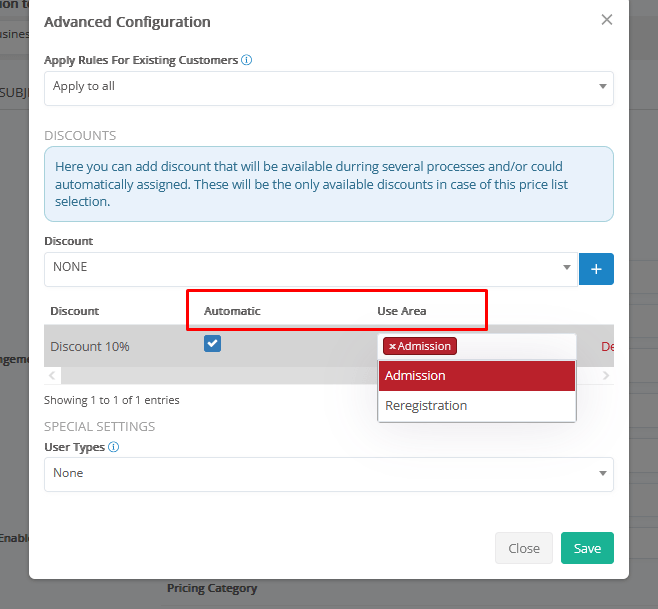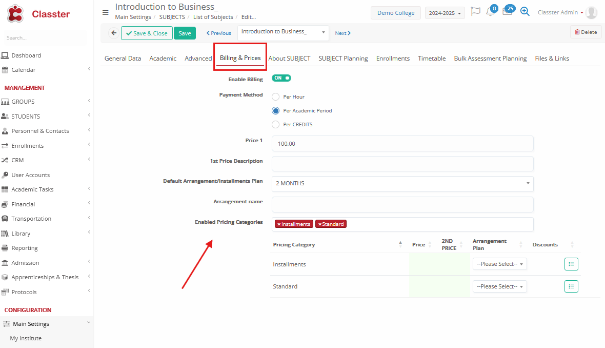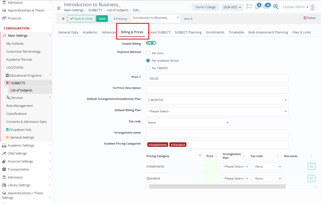 - Pricing Category → the default subject pricing category (used in billing, for multiple subject prices based on various attributes)