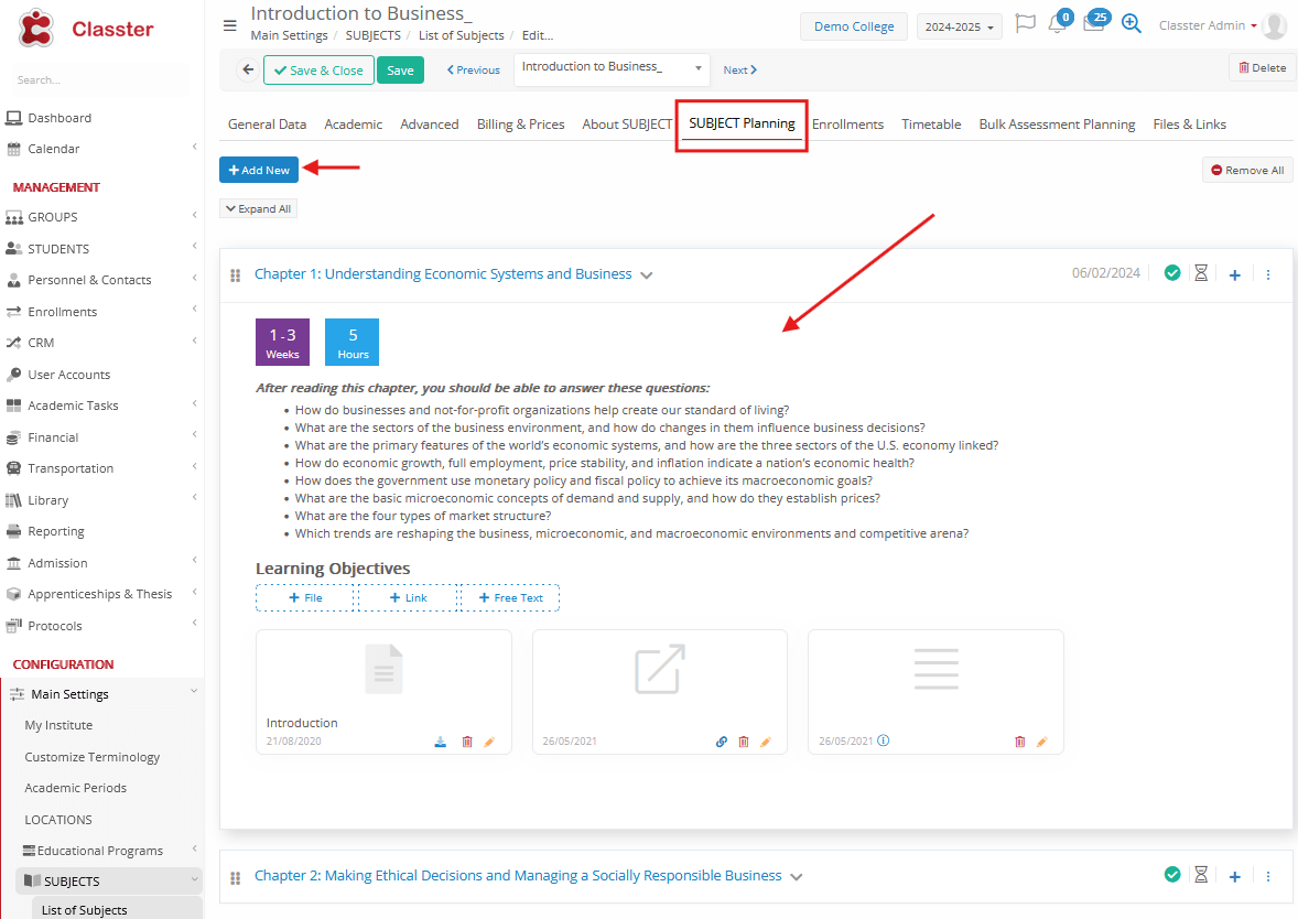 - _Subject_ Planning Tab (custom schedule subject plan, with chapters, content data, etc.)