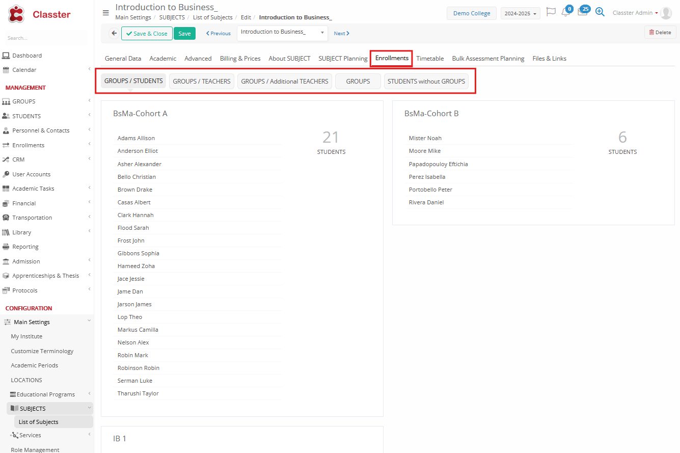 - Enrollments Tab (subject connections to groups, students, teachers, etc)