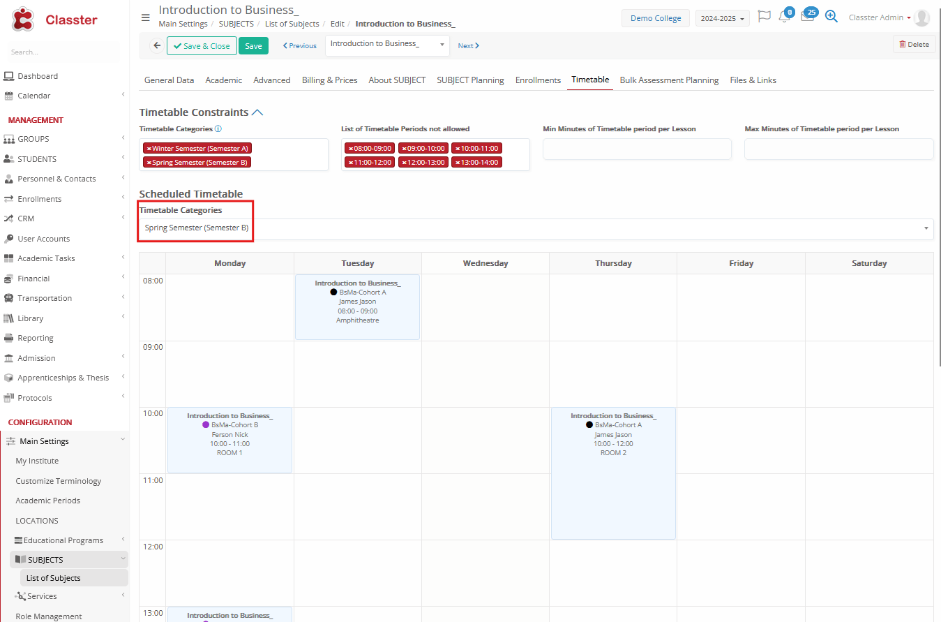 - Timetable Categories: Assign specific timetable categories for scheduling (e.g., Semester A, Morning, Afternoon).