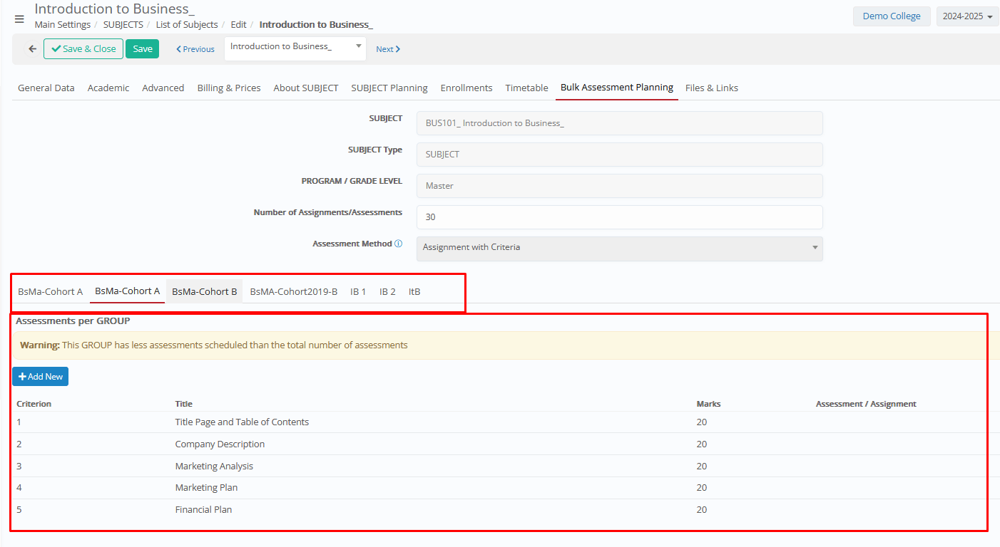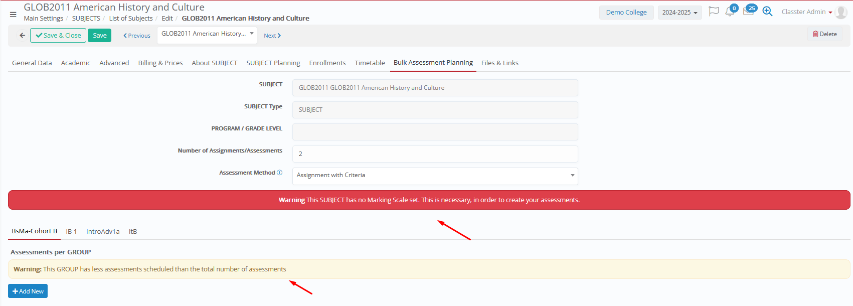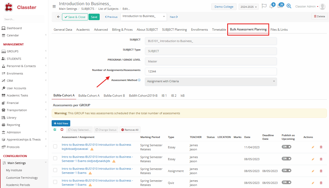 Warning 2: This _Group_ has fewer assessments scheduled than the total number of assessments. How to address → This is a message warning about the field “Number of Assignments/Assessments” expected (above).