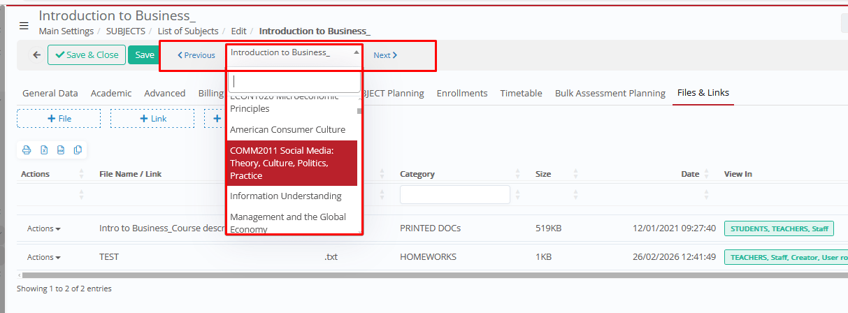 - Displays which programs or curricula include this _Subject_ (e.g., BSc Business Management 2020, BSc Business Management 2021).