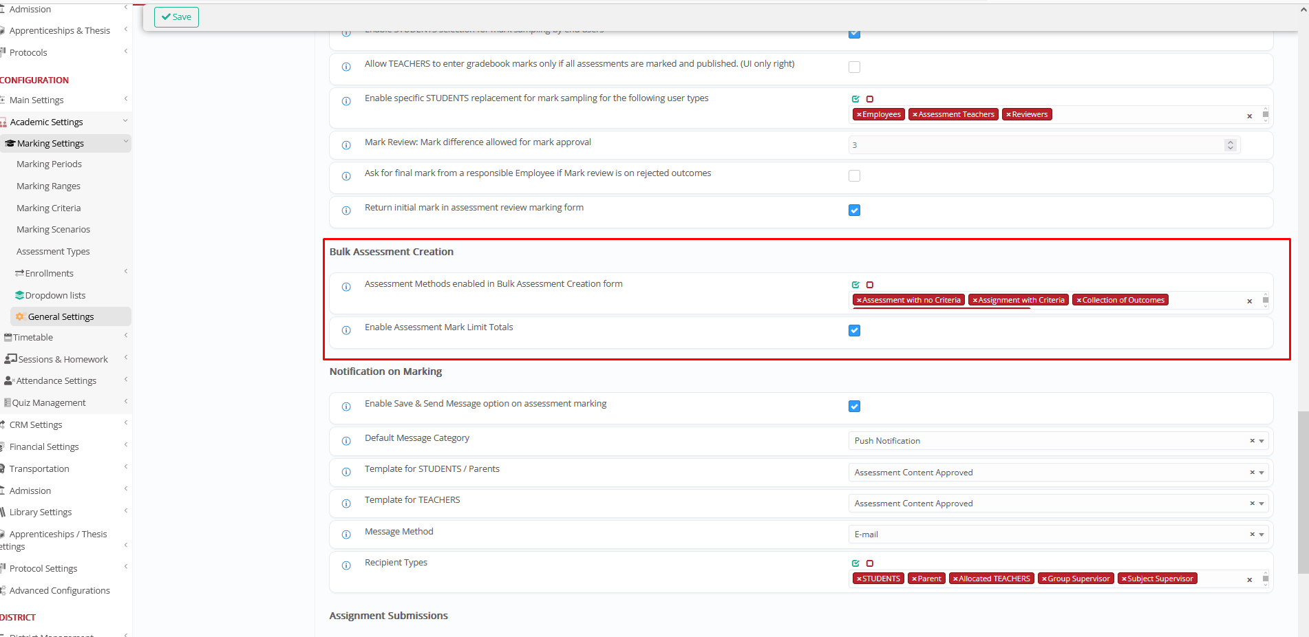 CONFIGURATION > Academic Settings > Marking Settings > General Settings > Assessments/Assignments > ‘Bulk Assessment Creation’ section