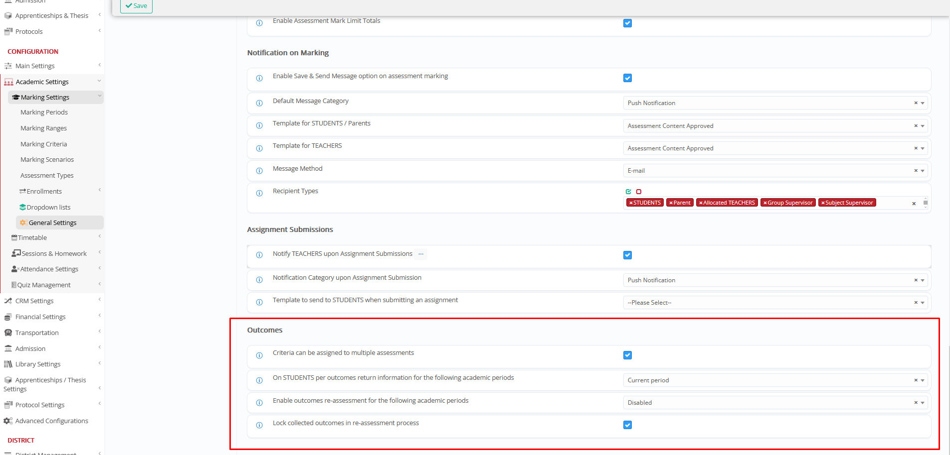 CONFIGURATION > Academic Settings > Marking Settings > General Settings > Assessments/Assignments > ‘Outcomes’ section