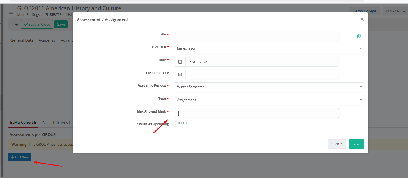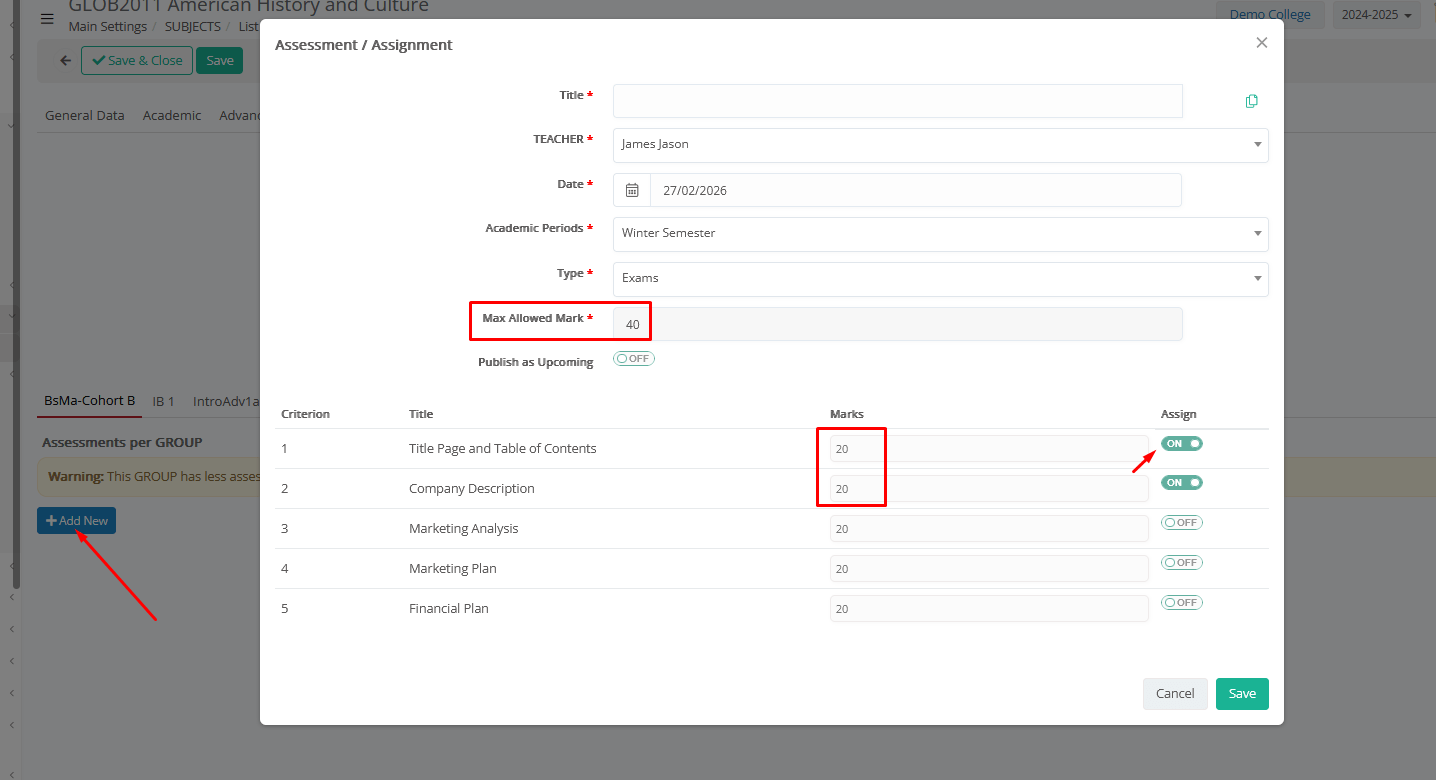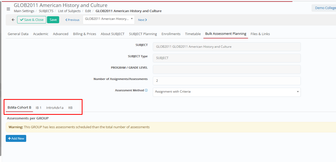 Click on Add New option from any _Group_ Tab. Based on _Group_ Planning → Option to align assessment setup with group-level planning already defined.