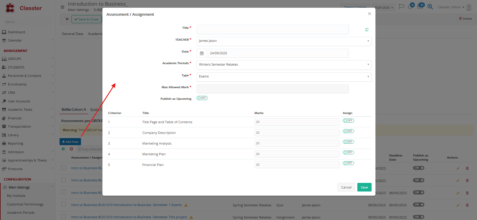 Since a marking scenario with criteria is set at the Subject Form > ‘Academic’ Tab > Criteria Model Scenario, the creation will inherit the criteria and allow the user to select during creation: