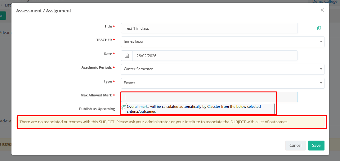 Info & Warning: (At the Max Allowed Mark) “Overall marks will be calculated automatically by Classter from the below selected criteria/outcomes.” & “There are no associated outcomes with this _Subject_.” Why → This is based on the selected Assessment Method: