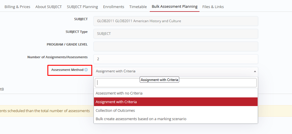 *Available Assessment Methods must be pre-configured at CONFIGURATION > Academic Settings > Marking Settings > General Settings > Assessments/Assignments > ‘Bulk Assessment Creation’ section > “Assessment Methods enabled in Bulk Assessment Creation form” setting