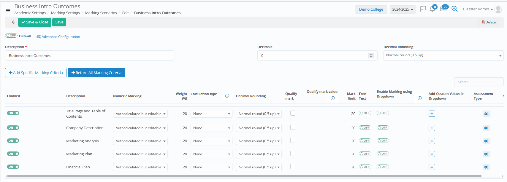 From CONFIGURATION > Academic Settings > Marking Settings > Marking Criteria.