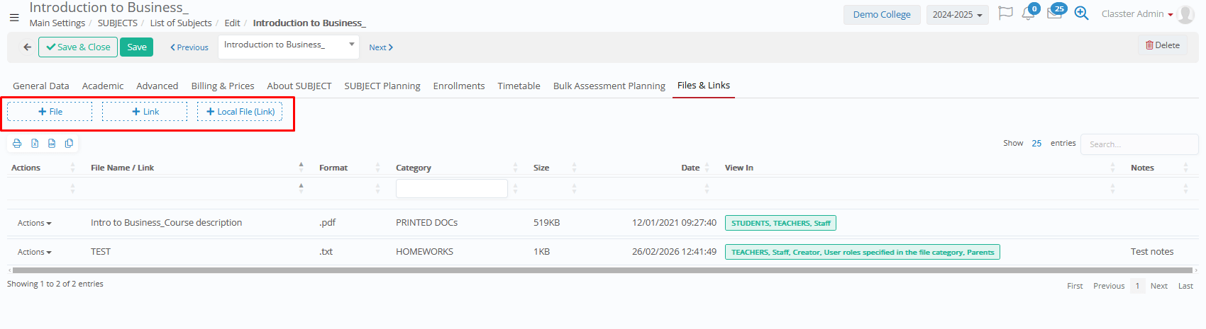 - Delete→ Deletes the subject from the current academic period. Please note that if the subject is connected to various entities, these connections must be erased first.
