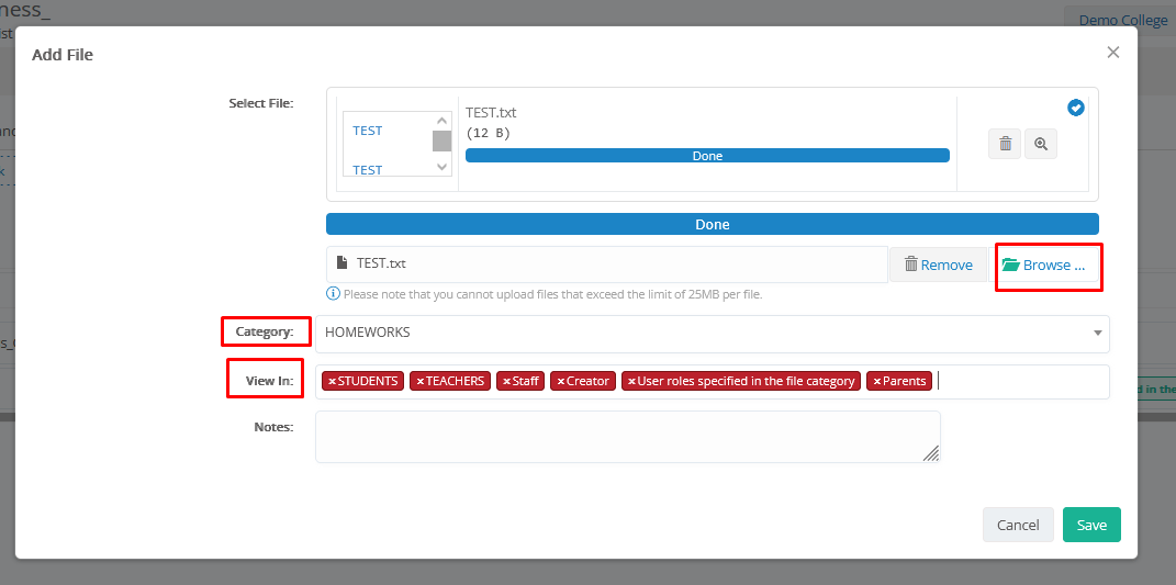 - View in: Make the file visible to other users. You can select the file to be visible at _Students_, _Teachers_, Staff, Parents, the Creator, and/or specific user roles (as defined in the file category).