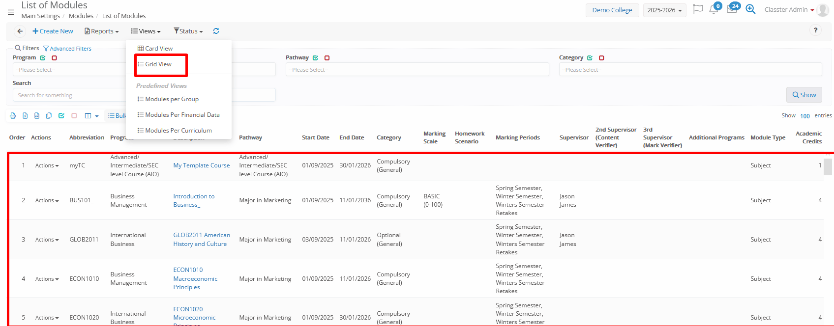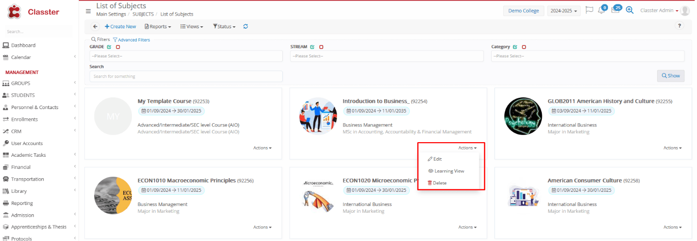- Learning View: From this option, you can access and edit quickly an academic-focused view of the subject quickly, including: