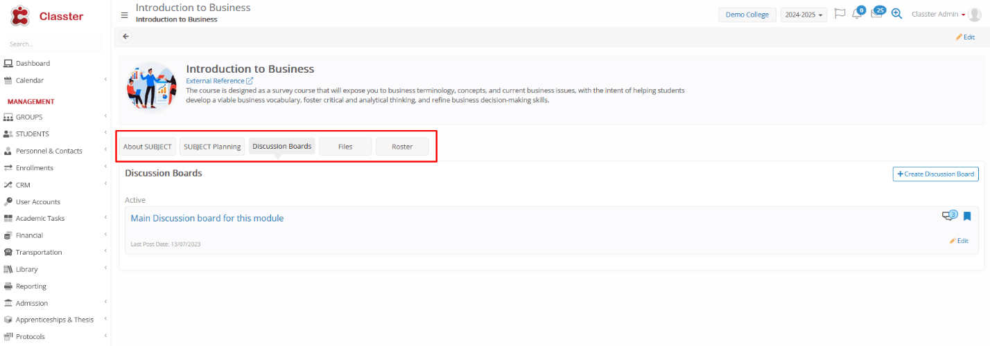 About Subject (refer to relevant content above), Subject Planning (refer to relevant content above), Discussion Boards – Collaborative space for communication. Discussion Board Manual, Files, Roster – Displays the list of enrolled _Students_ and associated groups and teachers.