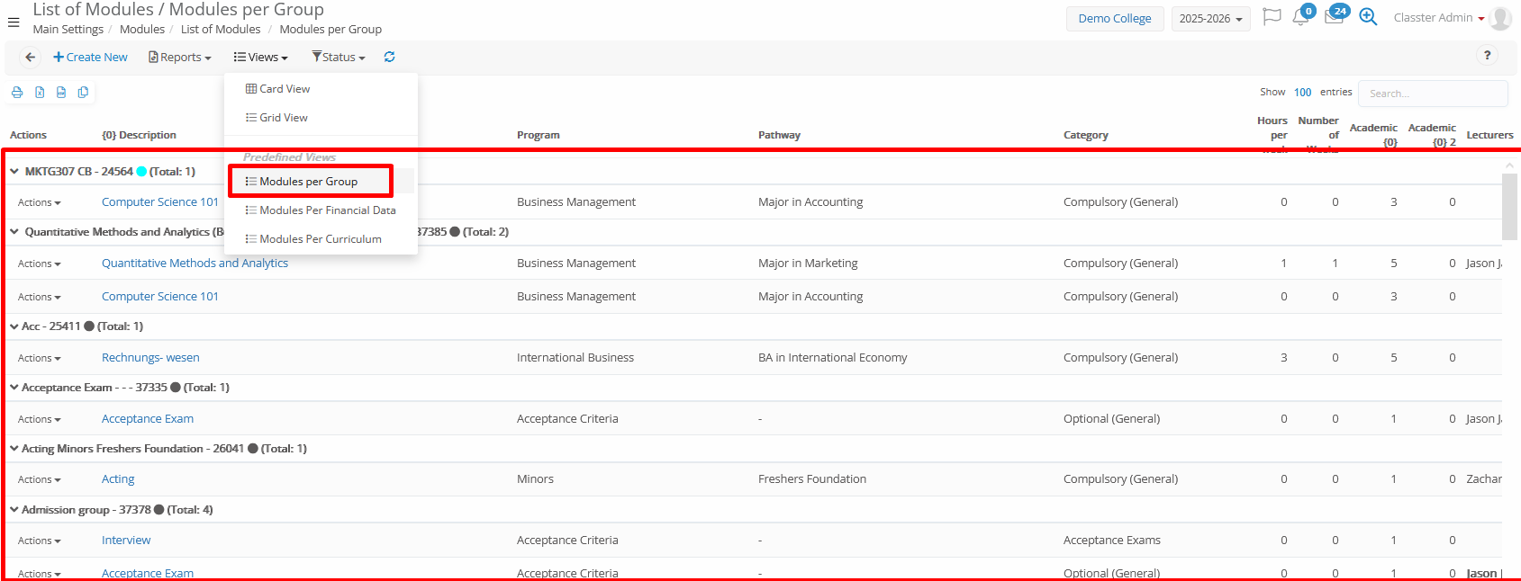 ! In Higher Education mode, this field is just informative and used as a pre-defined option. The actual final alternatives are configured through the Curricula.