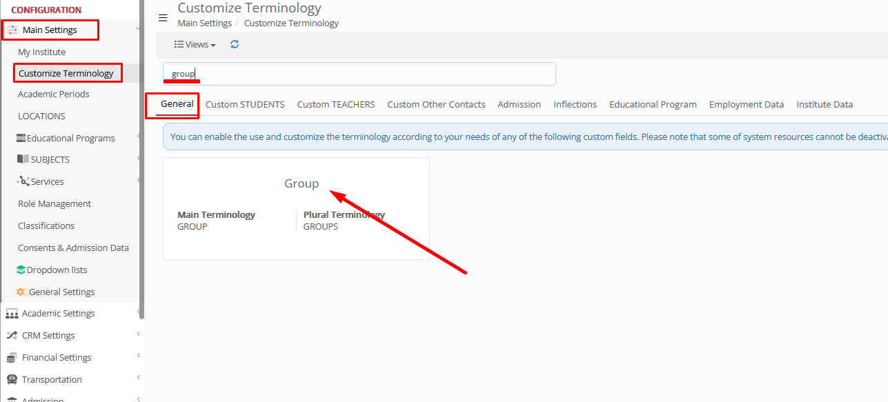 Group categories are configured from CONFIGURATION > Main Settings > Dropdown Lists > Type: System & Dropdown list: _Group_ Type > Property “In Main” in the Types. Connect types to the groups (Group card > General Data > _Group_ Categories.