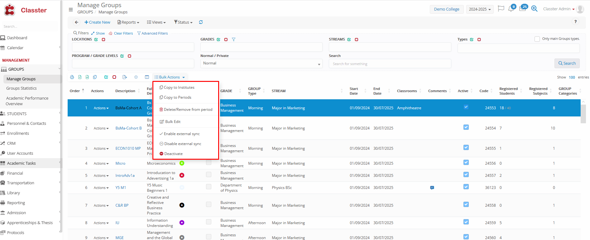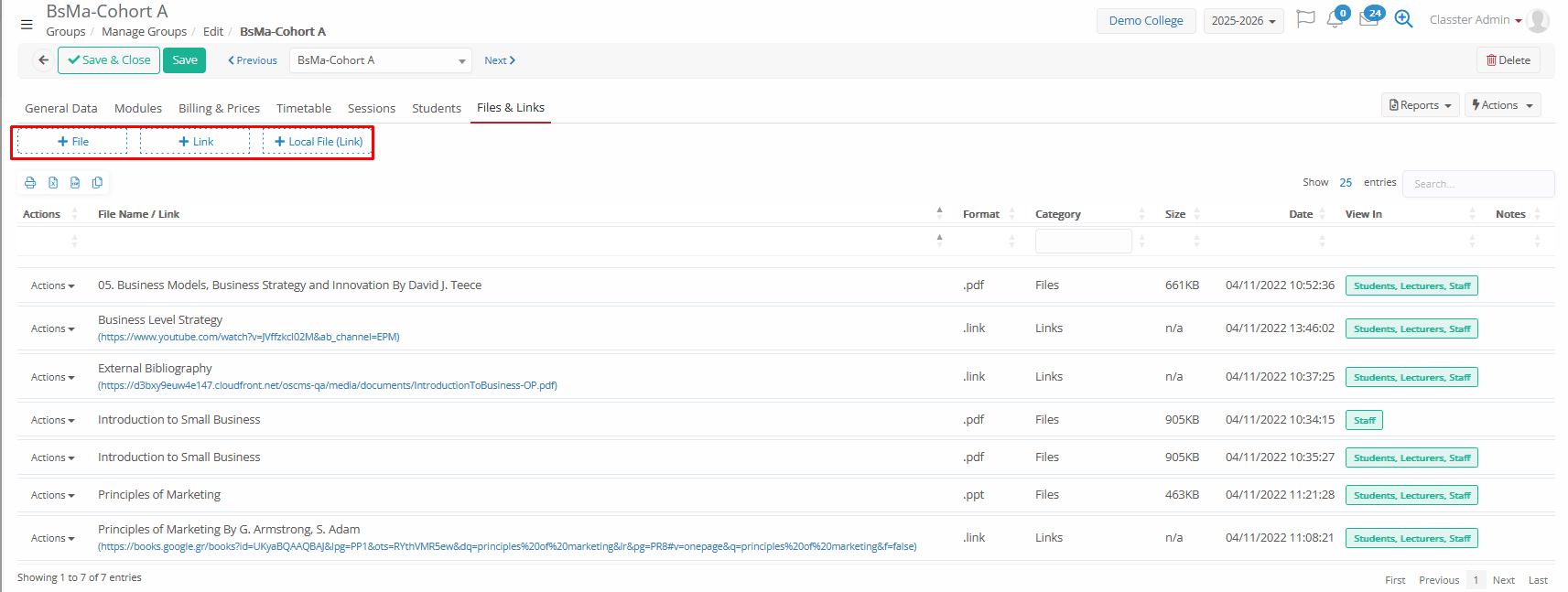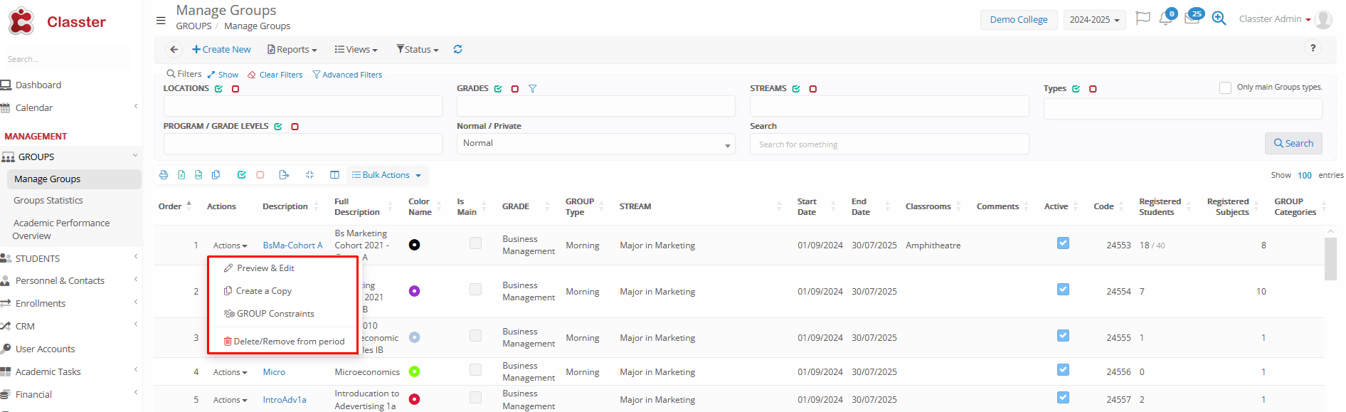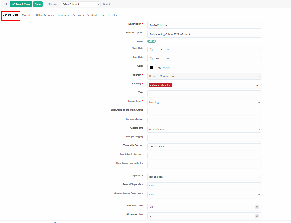 - Start Date / End Date: Defines the active timeframe of the Group in the current academic period (no limitations, just informative, you can simply use the start-end dates of the academic period)