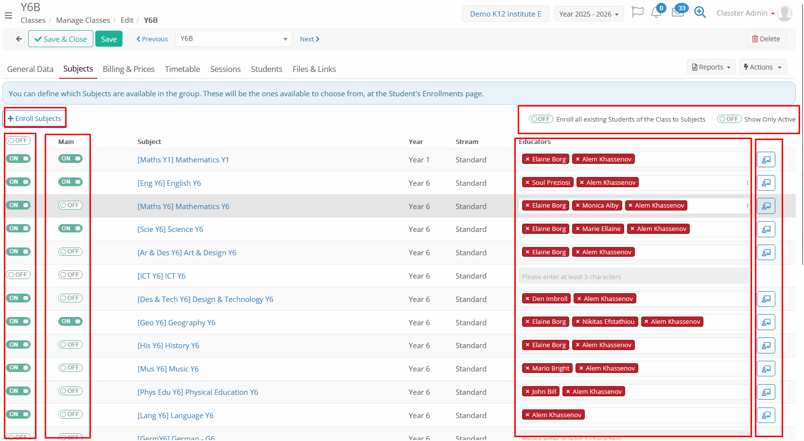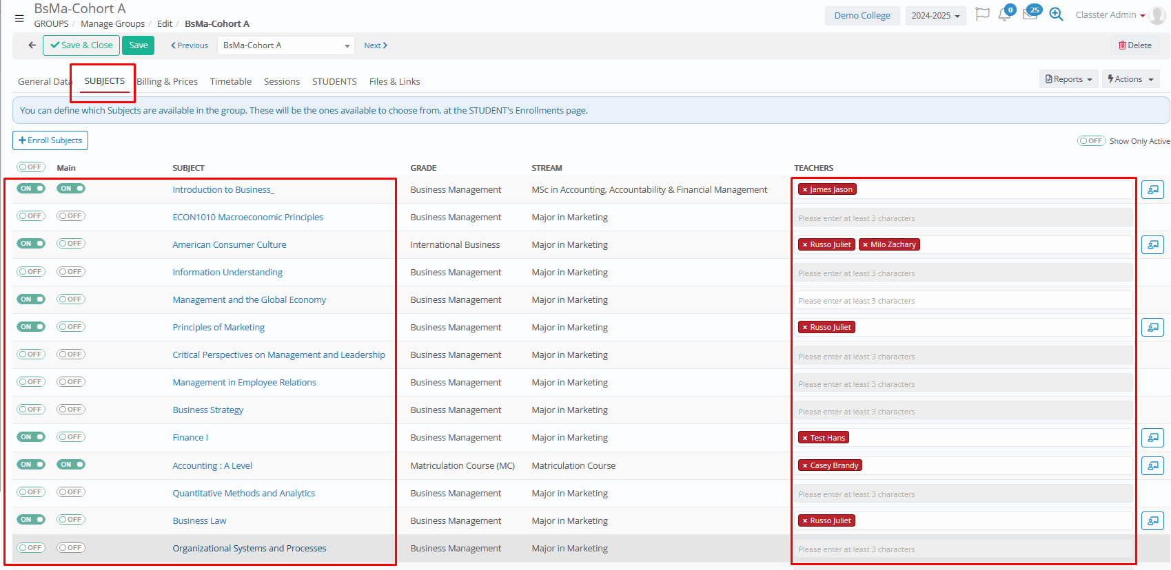 - Enable/Disable Subjects: Toggle subjects on to connect them with the group. Only enabled subjects are available for enrollment in the group (Students, Teachers).