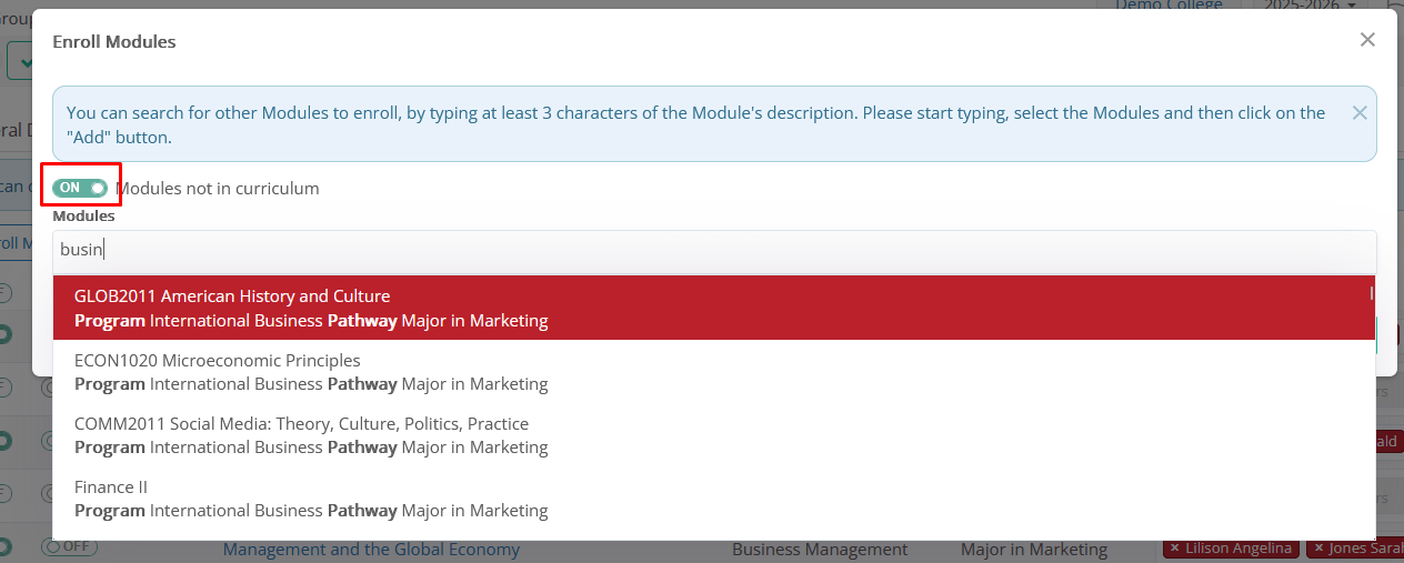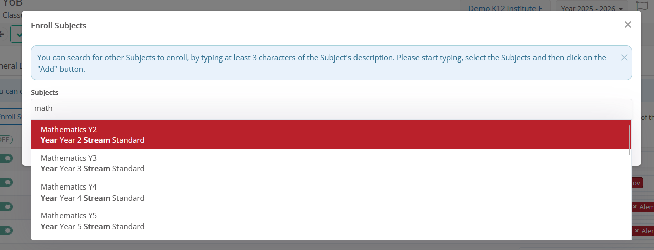- + Enroll Subjects: Use this option to add subjects that are not automatically shown in the list (mainly are not connected to the same default _Grades_ & _Streams_). Start typing the subject title/description, and the system will fill in the dropdown with the relevant options.