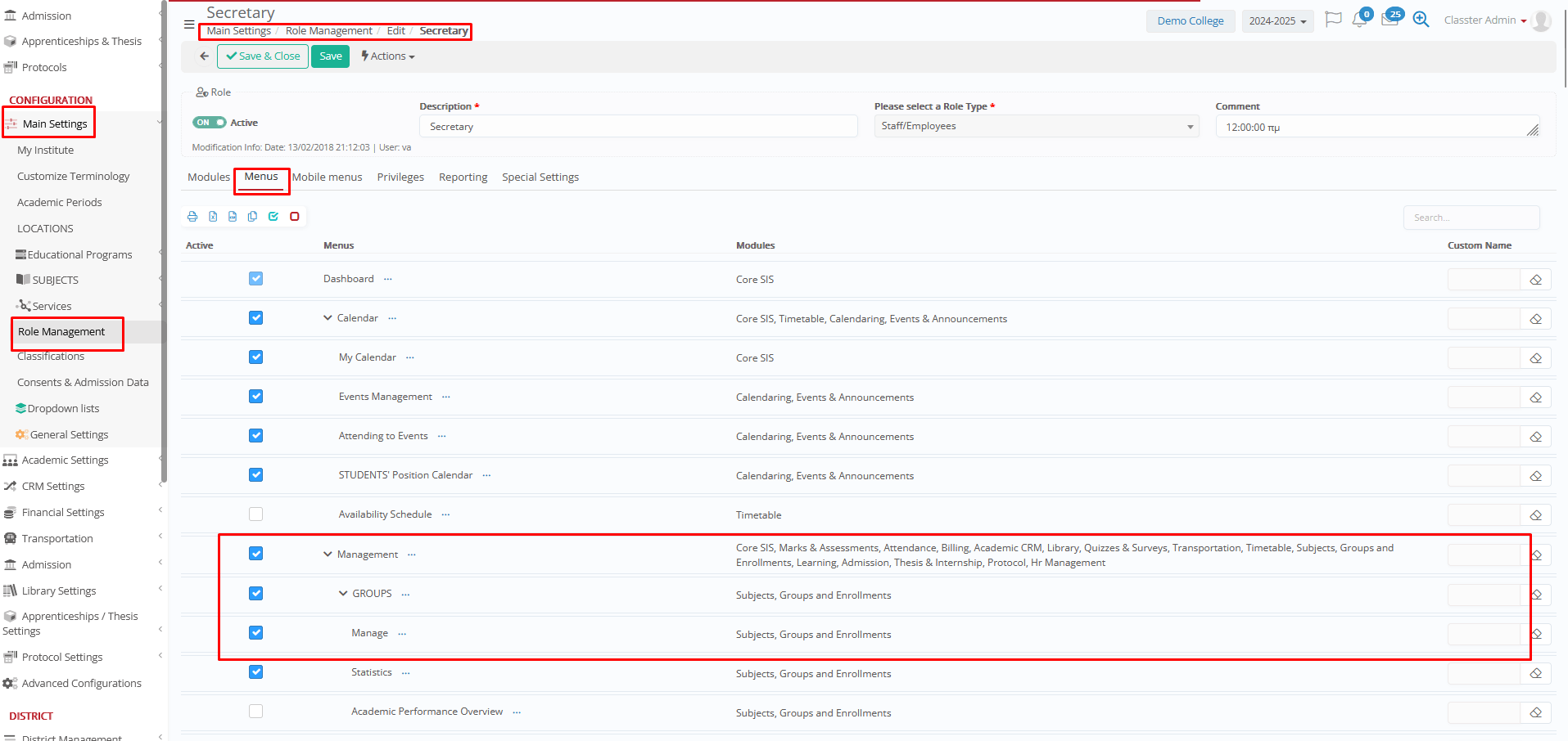 Navigate to: CONFIGURATION > Roles Management, select the role to configure (e.g., Secretary).