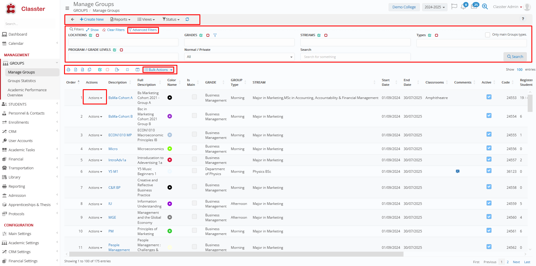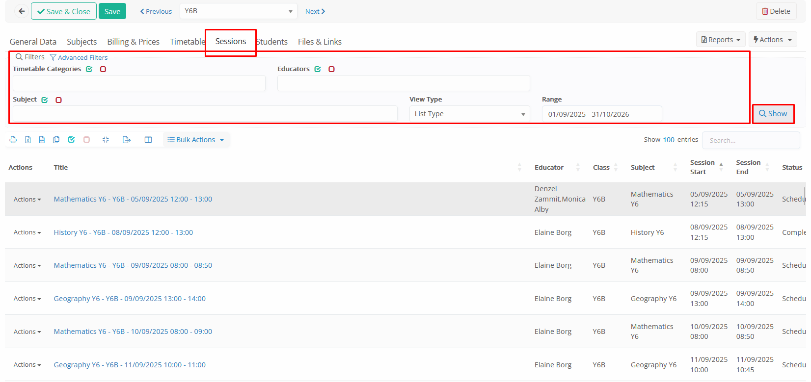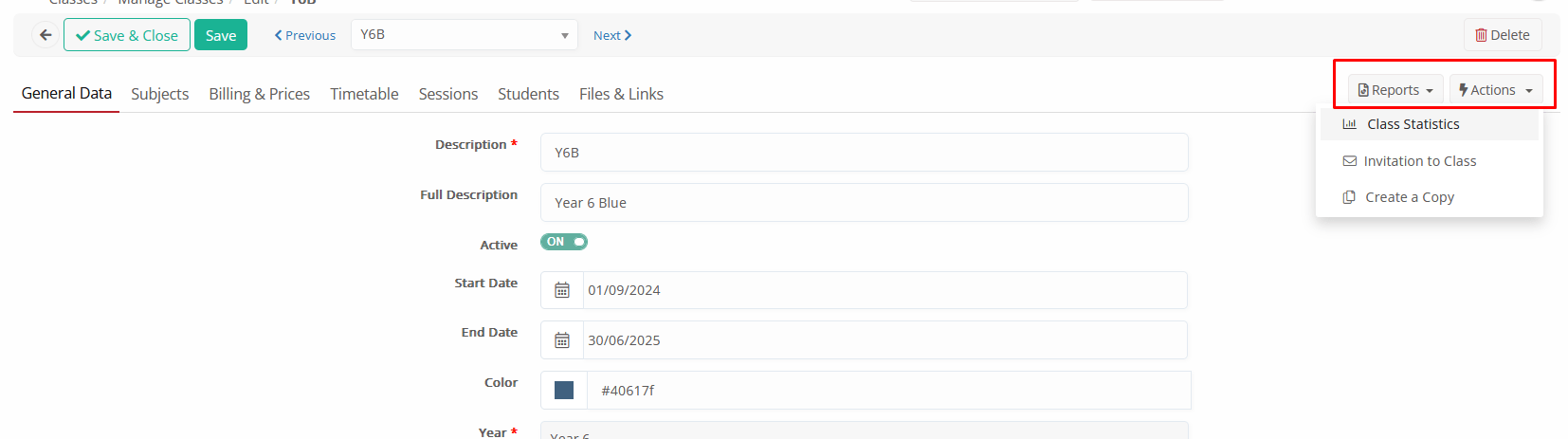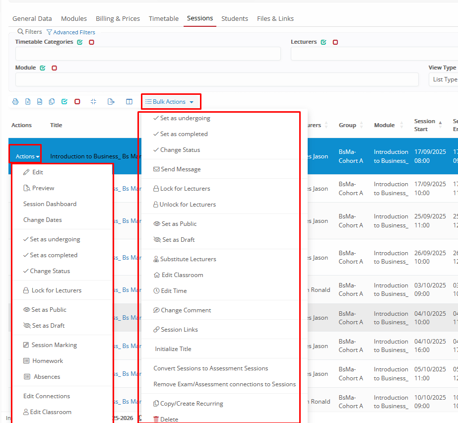 - When creating a new group, the option ‘Actions’ and the tabs: ‘Timetable’, ‘Sessions’, and ‘Students’, will not appear until you save/create the group.