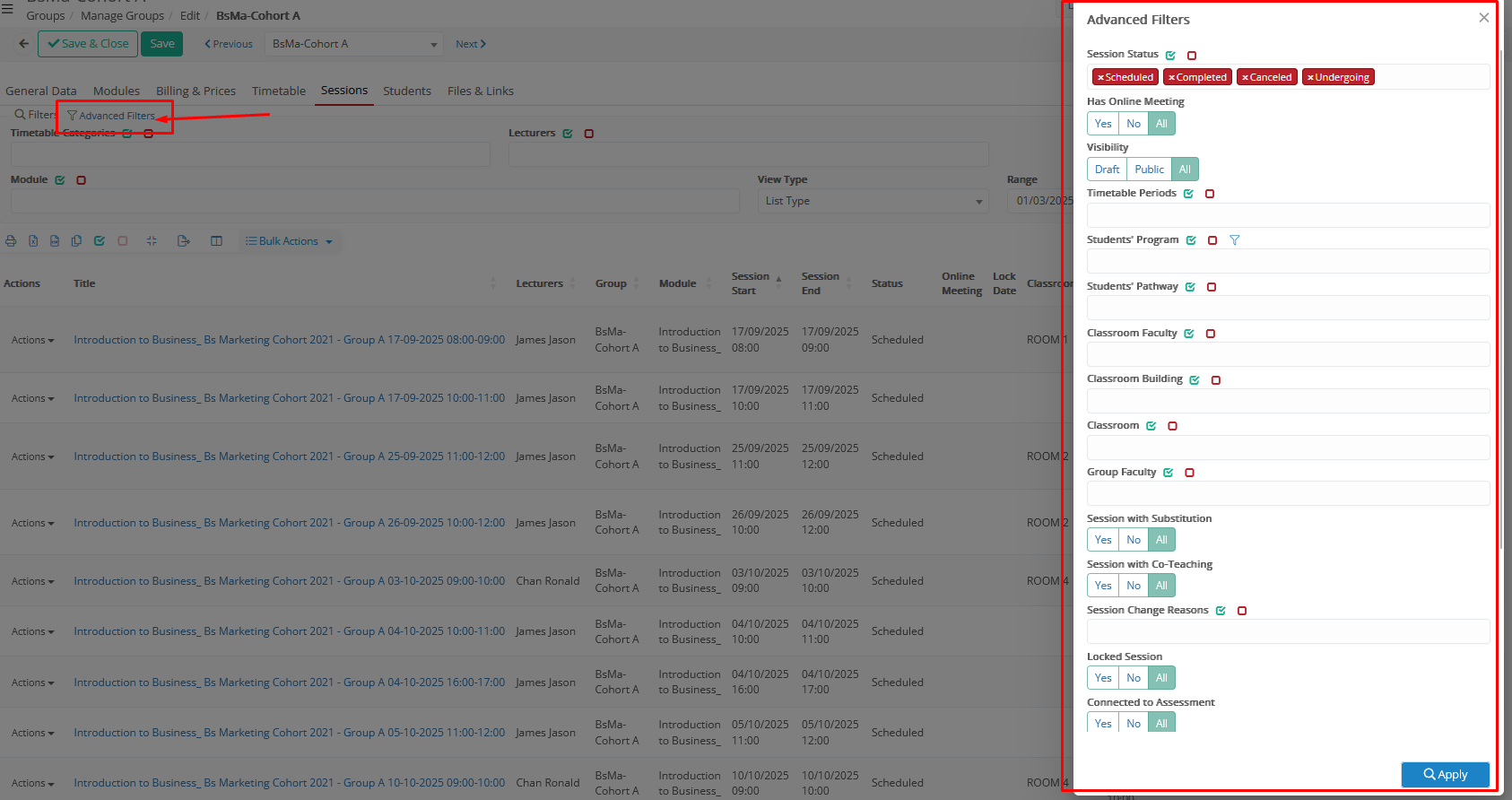 - _Group_ sessions in specific period (With/Without Sessions/All with Date filters): Filters the filter of _Groups_, based on their scheduled sessions in specific date periods.