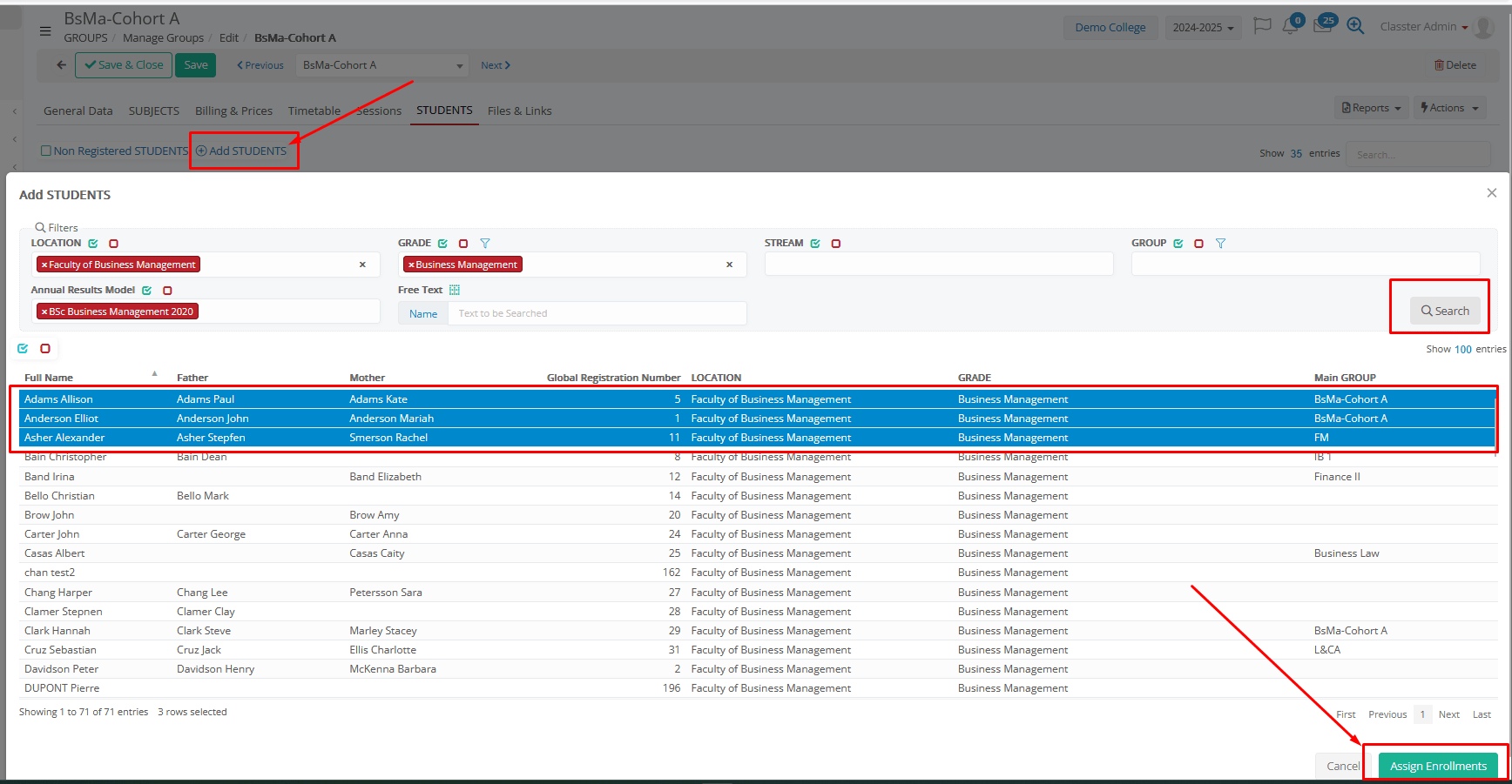 - After the Verification, they are saved in the system as Registered Students, automatically enrolled in the default _Grade_/Program and _Stream_ of the group, and added to the group.