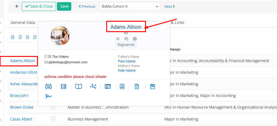 With important information such as Contact details, send Message, Medical info, ability to redirect to the Students’ Academic Progress view, etc.