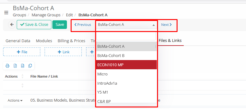 - Files: View of the group’s Files & Links (added from the Group card > Files & Links Tab).
