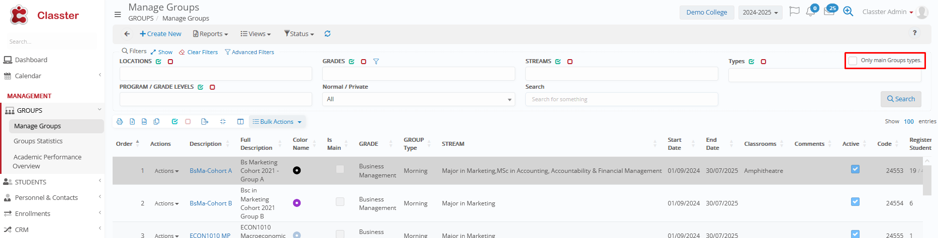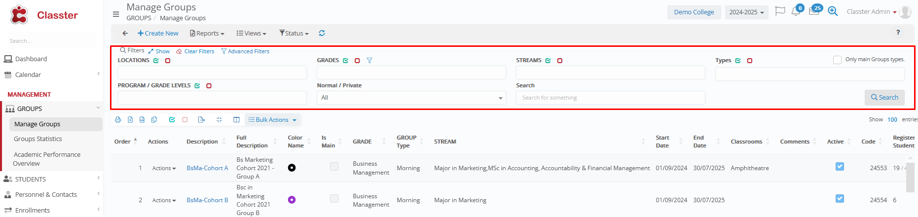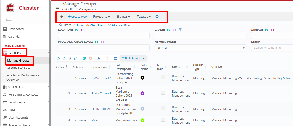 - _Groups_ with students (Yes/No/All): Filters the filter of _Groups_, based on whether they currently have student enrollments or not.