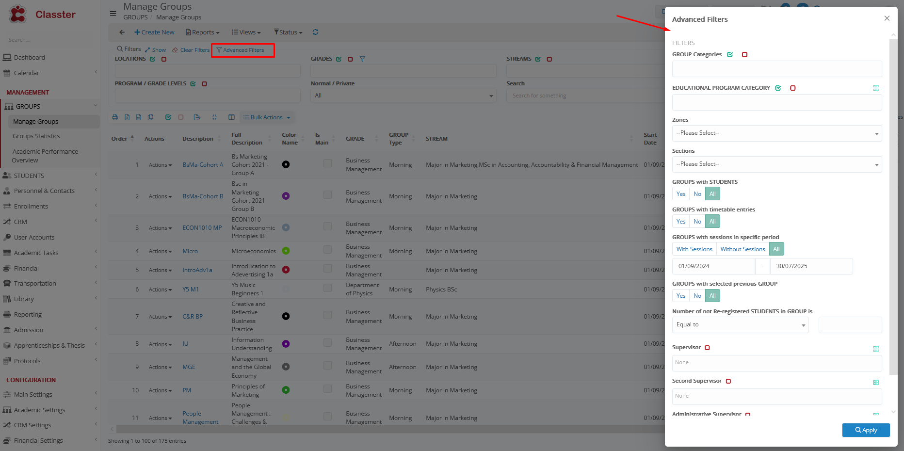 Advanced filters also exist in this filter, to additionally filter out groups based on their Group Types, Group Categories, ‘Is Main’ property, Sections, and Supervisors.