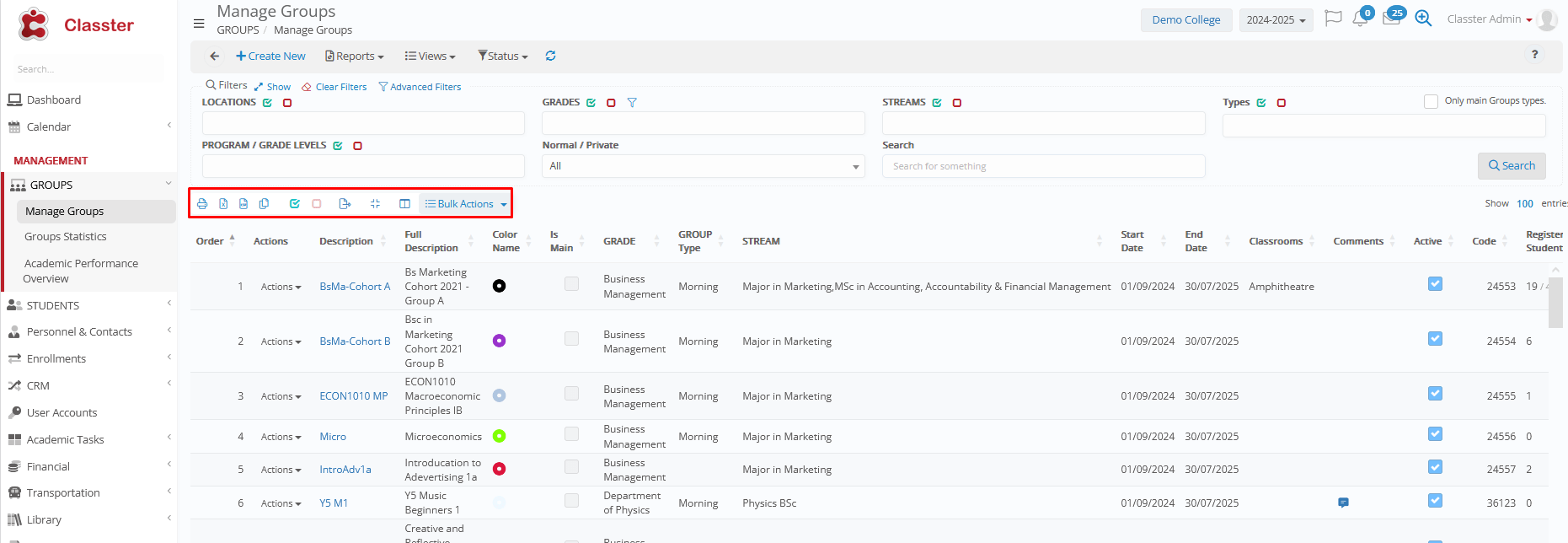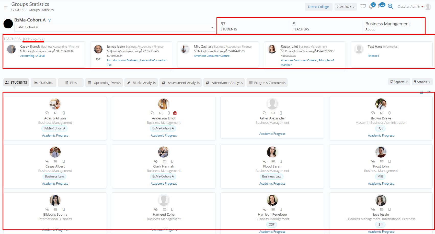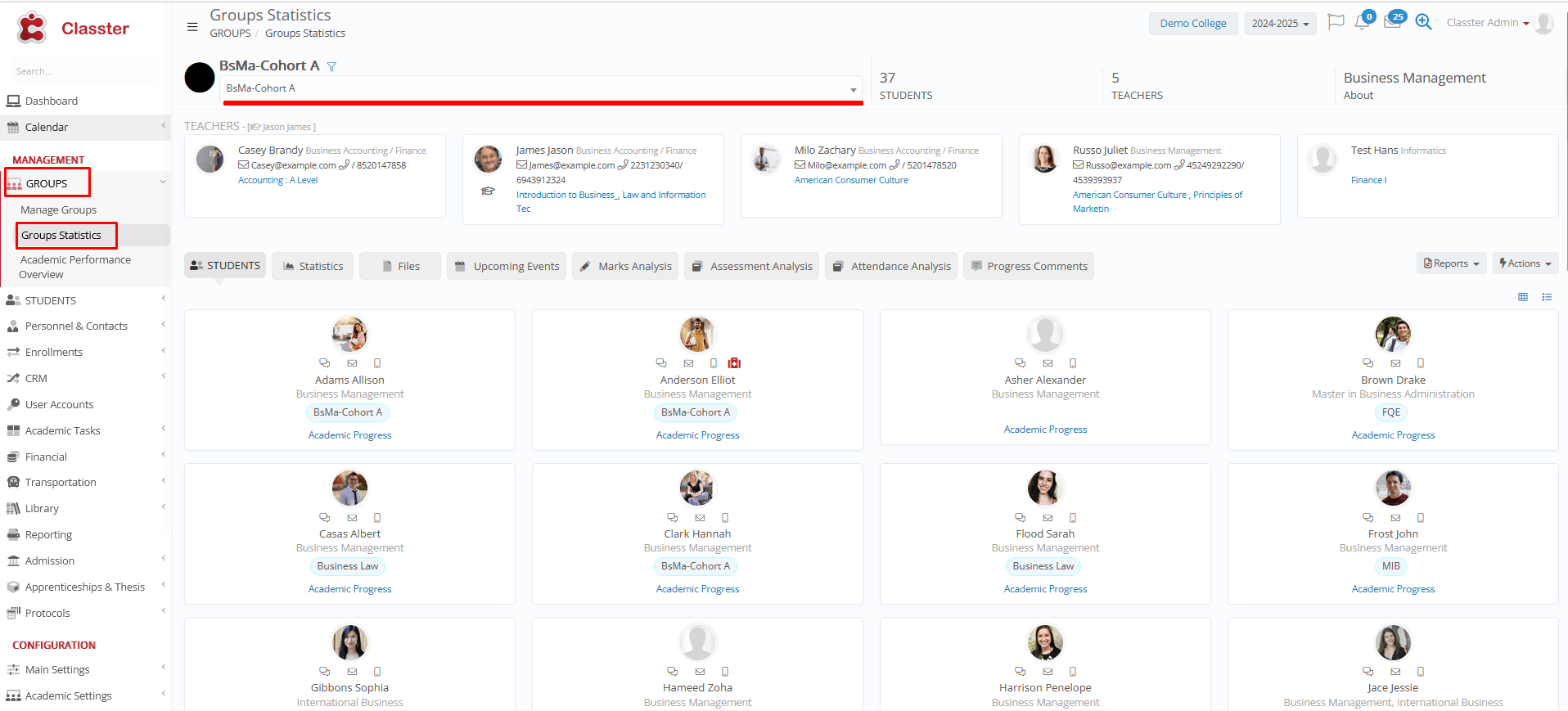 - Group Statistics: Displays important info of enrolled people (students with contact-medical info, teachers, etc.), Statistics related to assessments, Gradebook marks, Attendance, etc. (Same view as in menu MANAGEMENT > _Groups_ > _Groups_ Statistics)