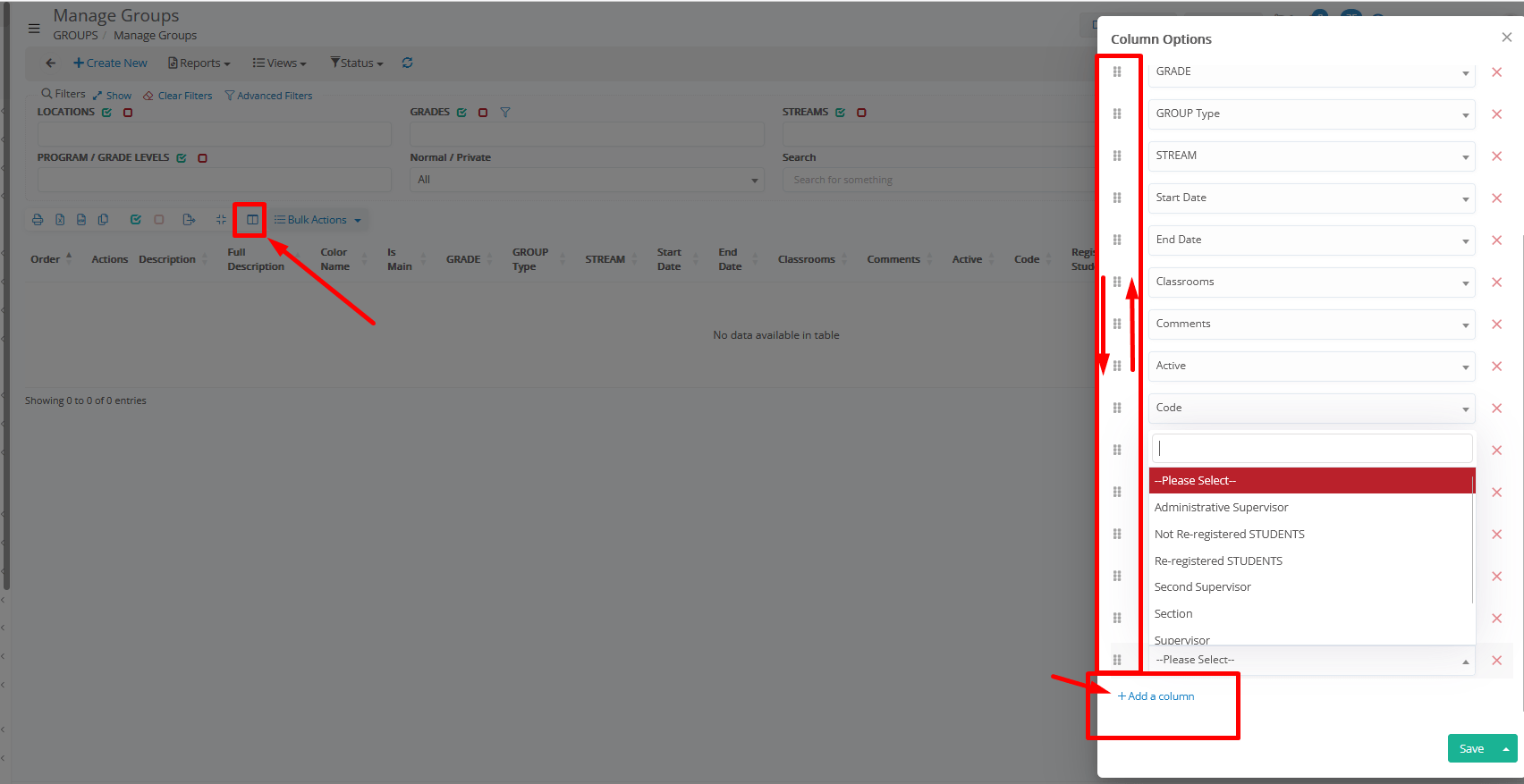 - Supervisor: Filters the filter of _Groups_, by their assigned supervisor (you need to start typing the teacher’s name for options to appear).